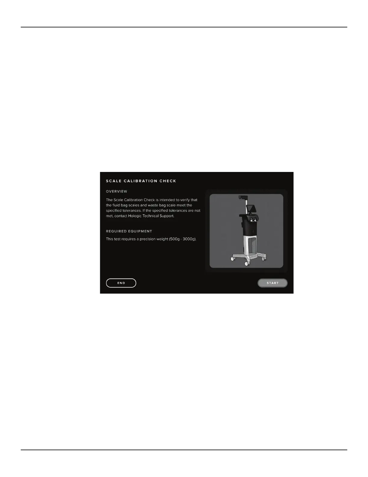 The Scale Calibration Check is intended to verify that the Fluid Bag Scales and Waste Bag Scale meet the specified