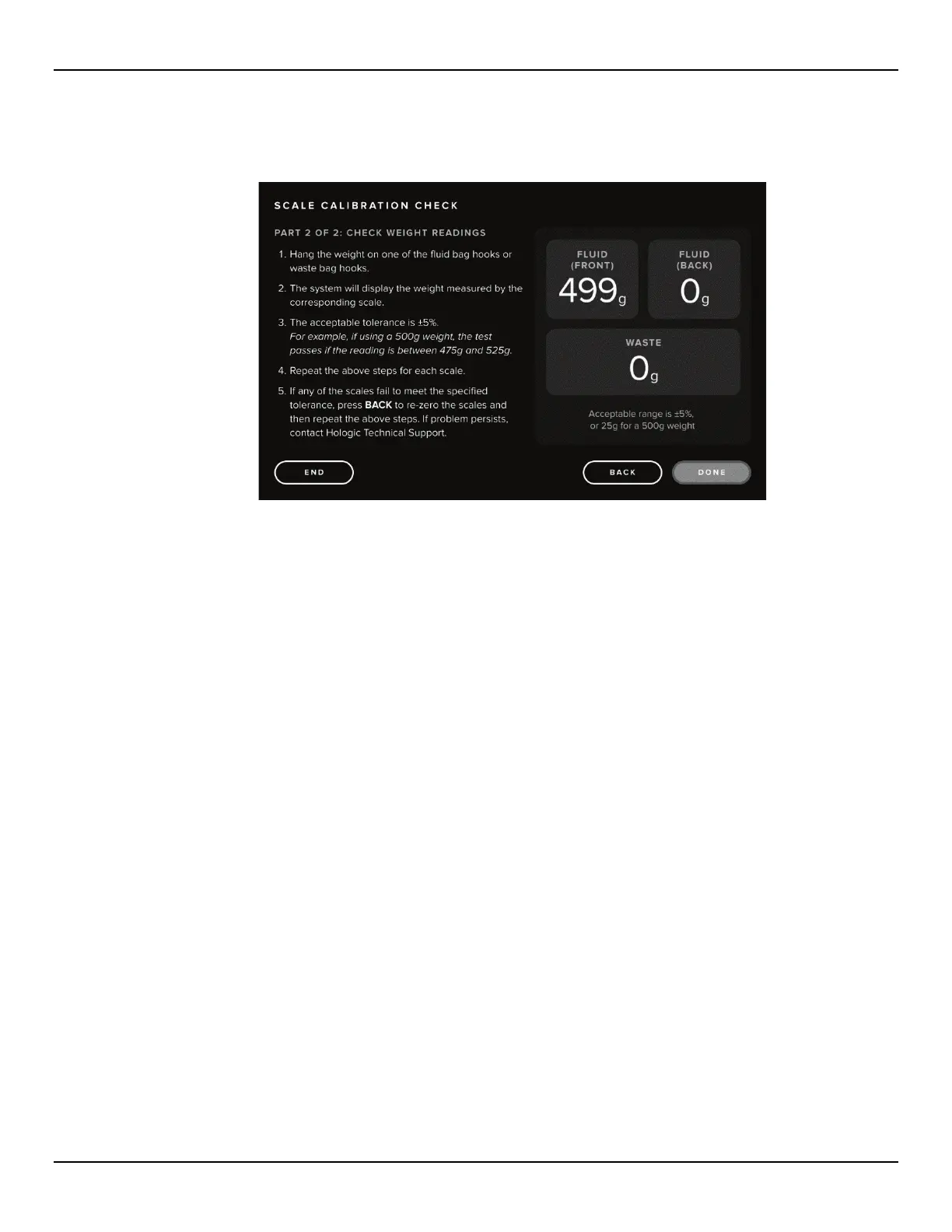 6.1.1.11 If the weight readings are still outside of the acceptable range, contact Technical Support.