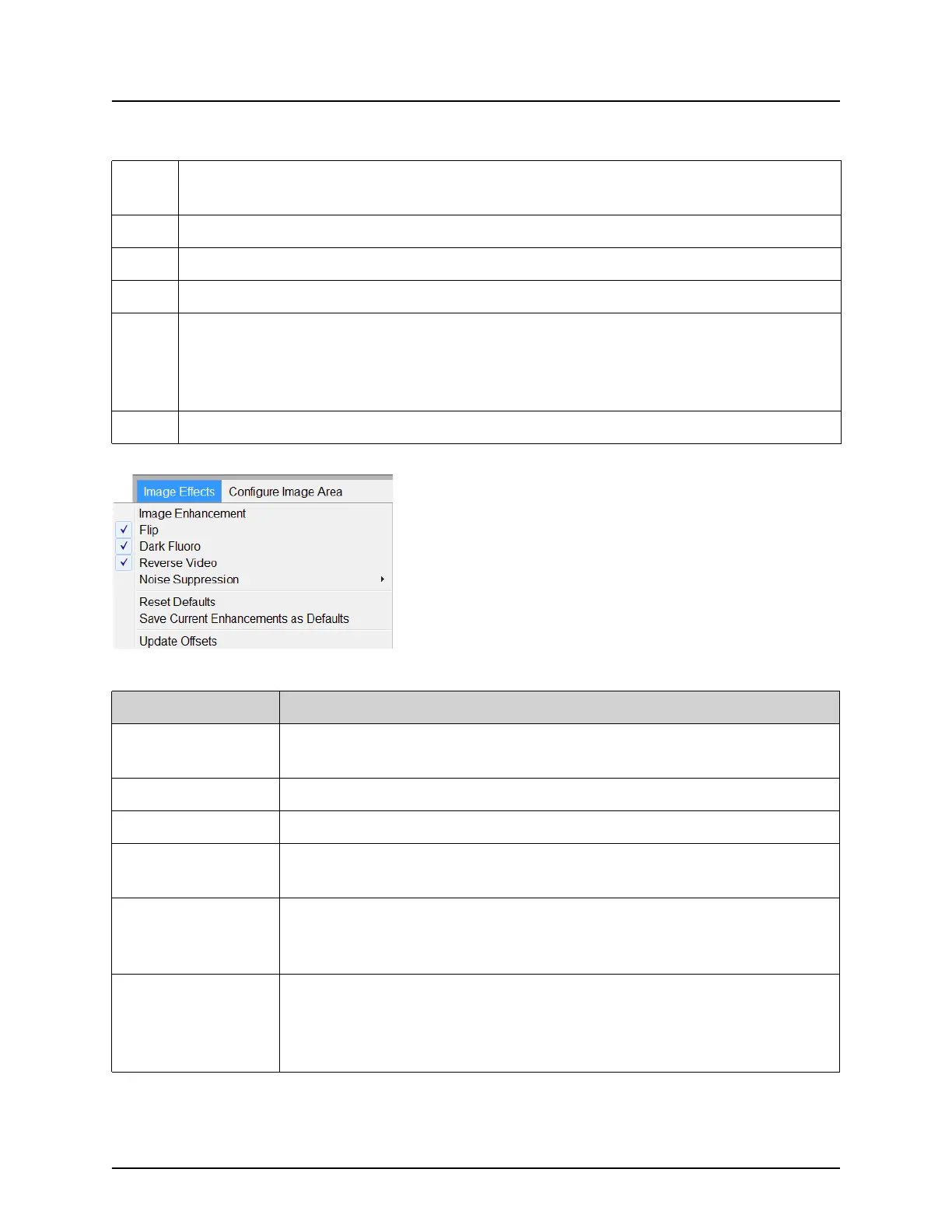 Reset Defaults Resets the image enhancements, flip, dark fluoro, reverse video,