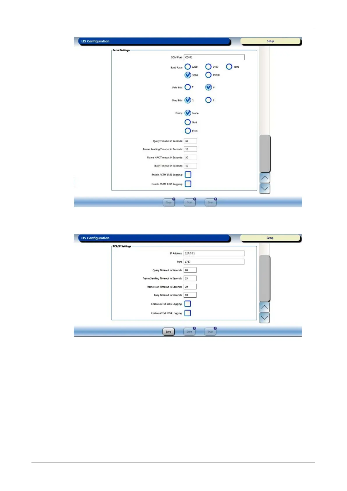 Hologic Panther System - Figure 39. LIS Configuration Screen-Serial Settings (Example); Figure 40. LIS Configuration Screen-TCP;IP Settings (Example)