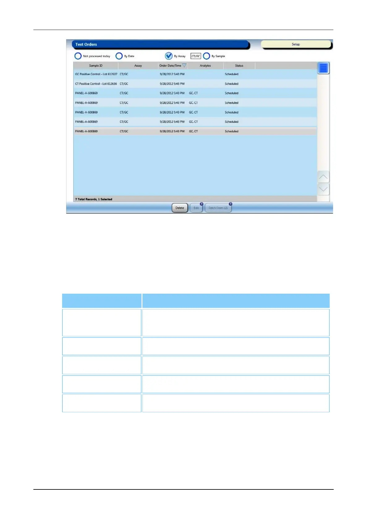 The table on the Test Orders screen displays the following information for each