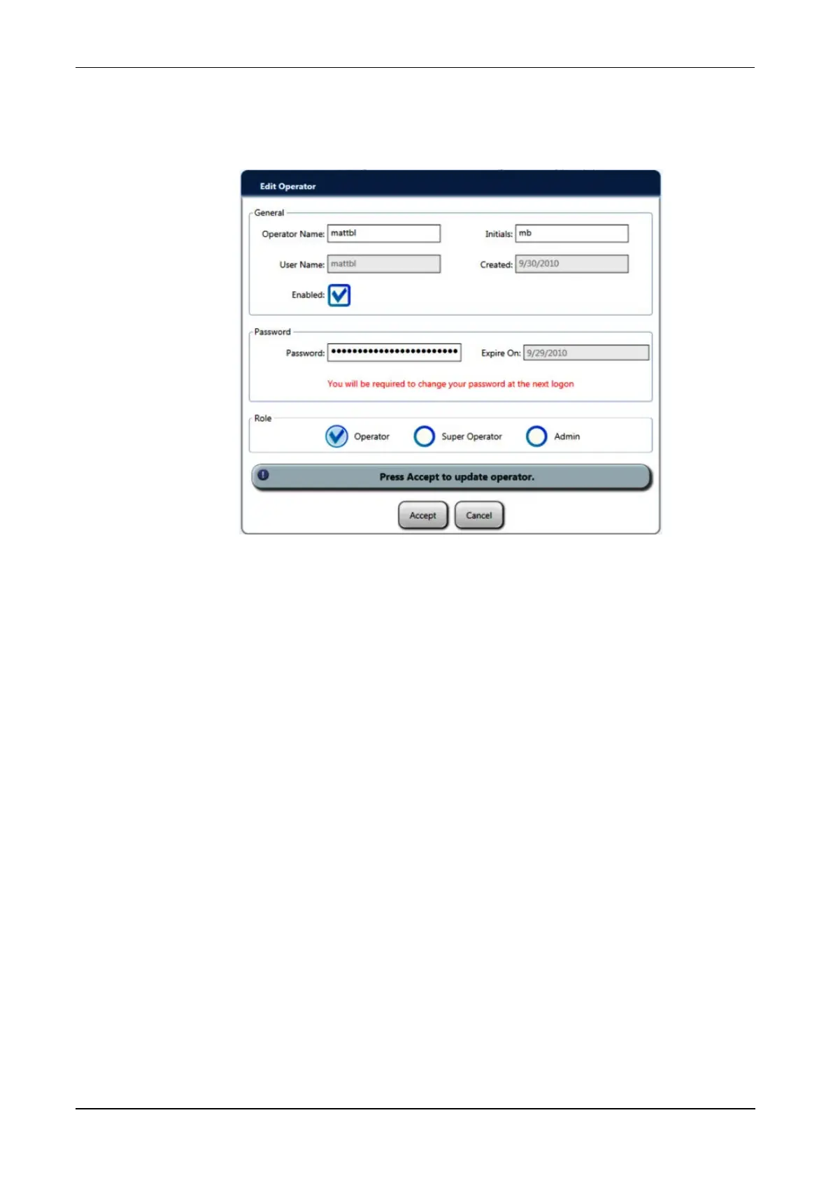 Use the Change Password window to alter the password of the operator currently logged