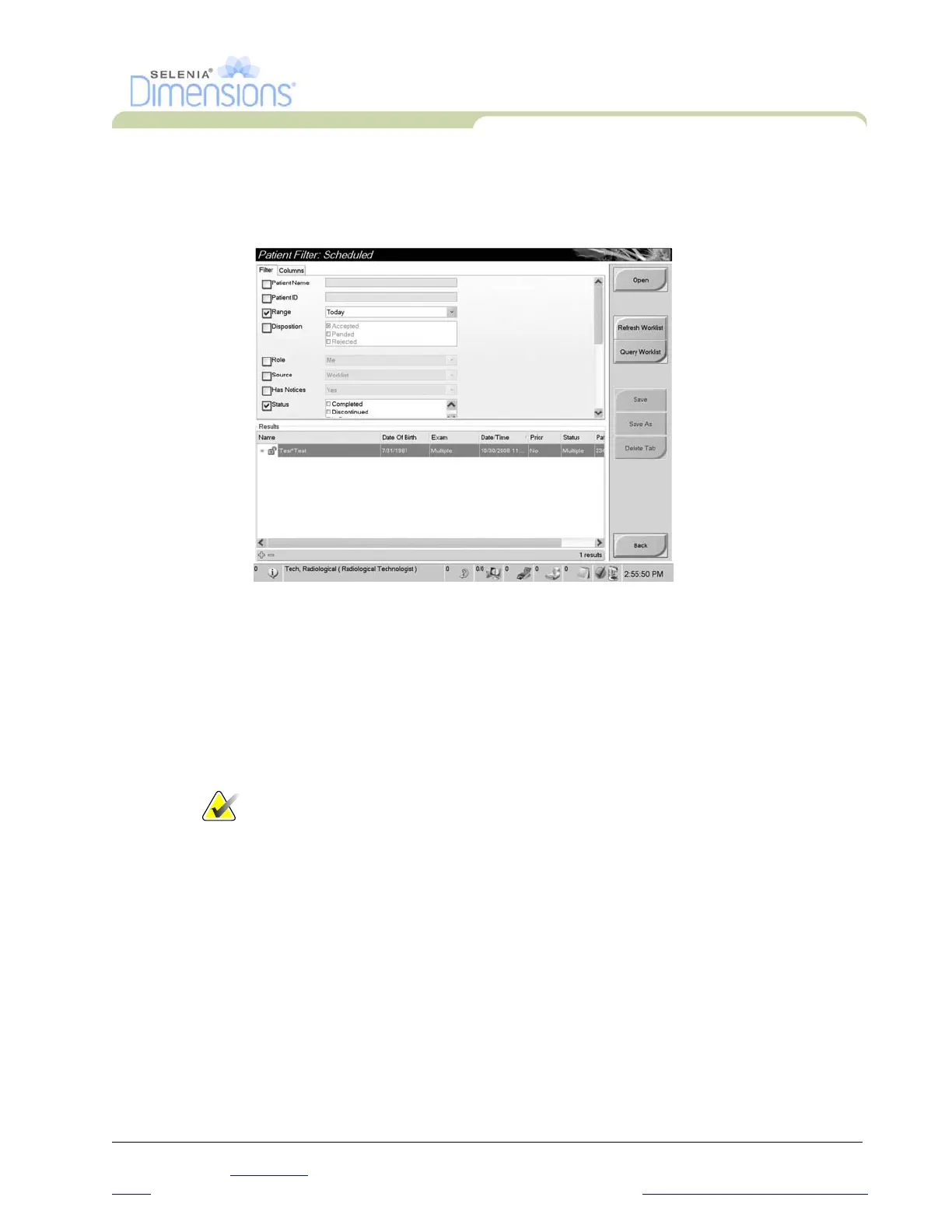 • The Filter tab accesses the parameters that select the patients who appear on the selected
