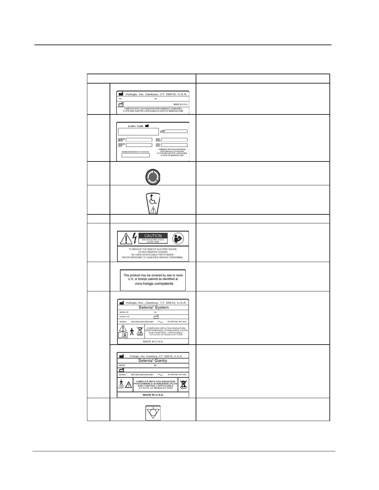 Hologic Selenia - Table 2: Label Descriptions