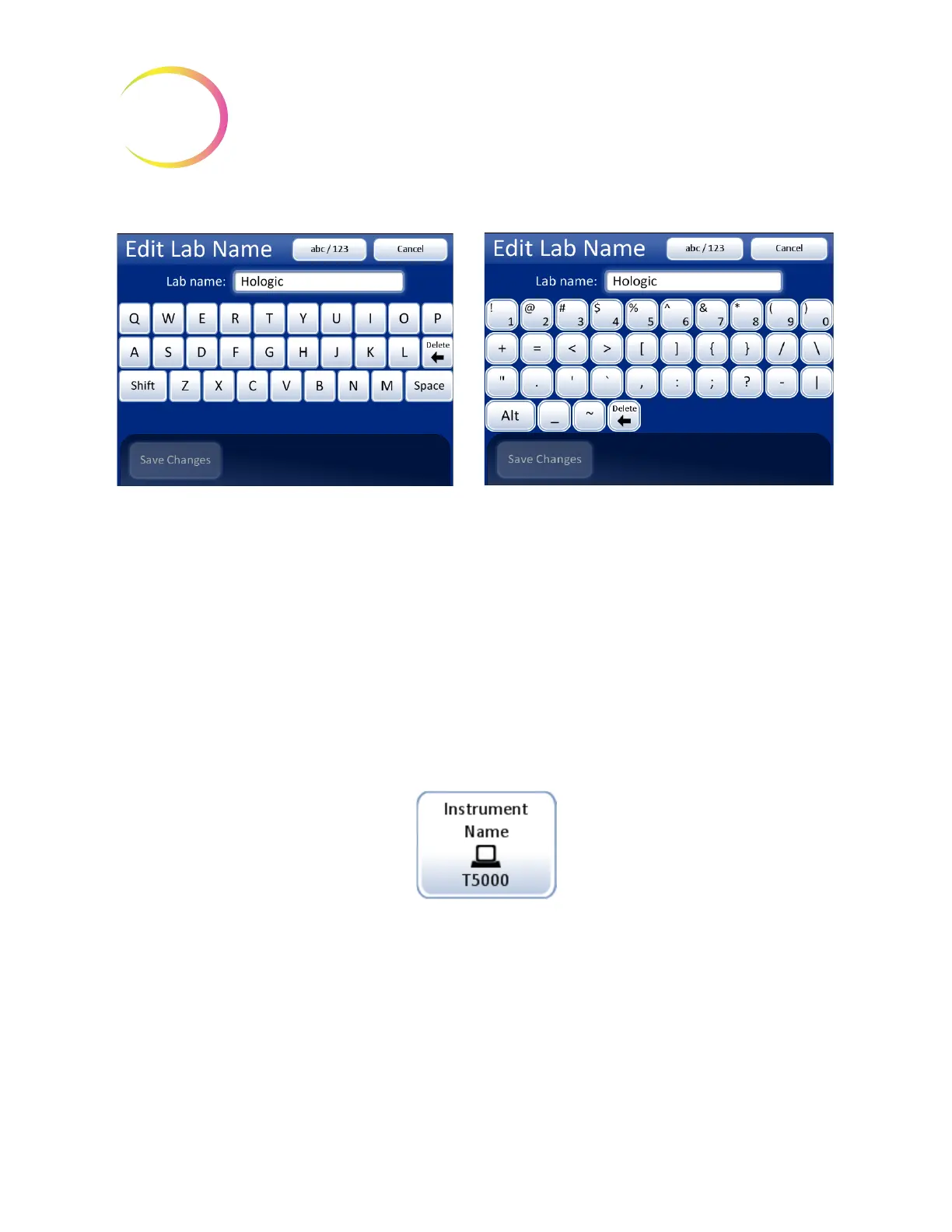 Figure 6-32 Edit Lab Name Keyboard and Keypad Screens