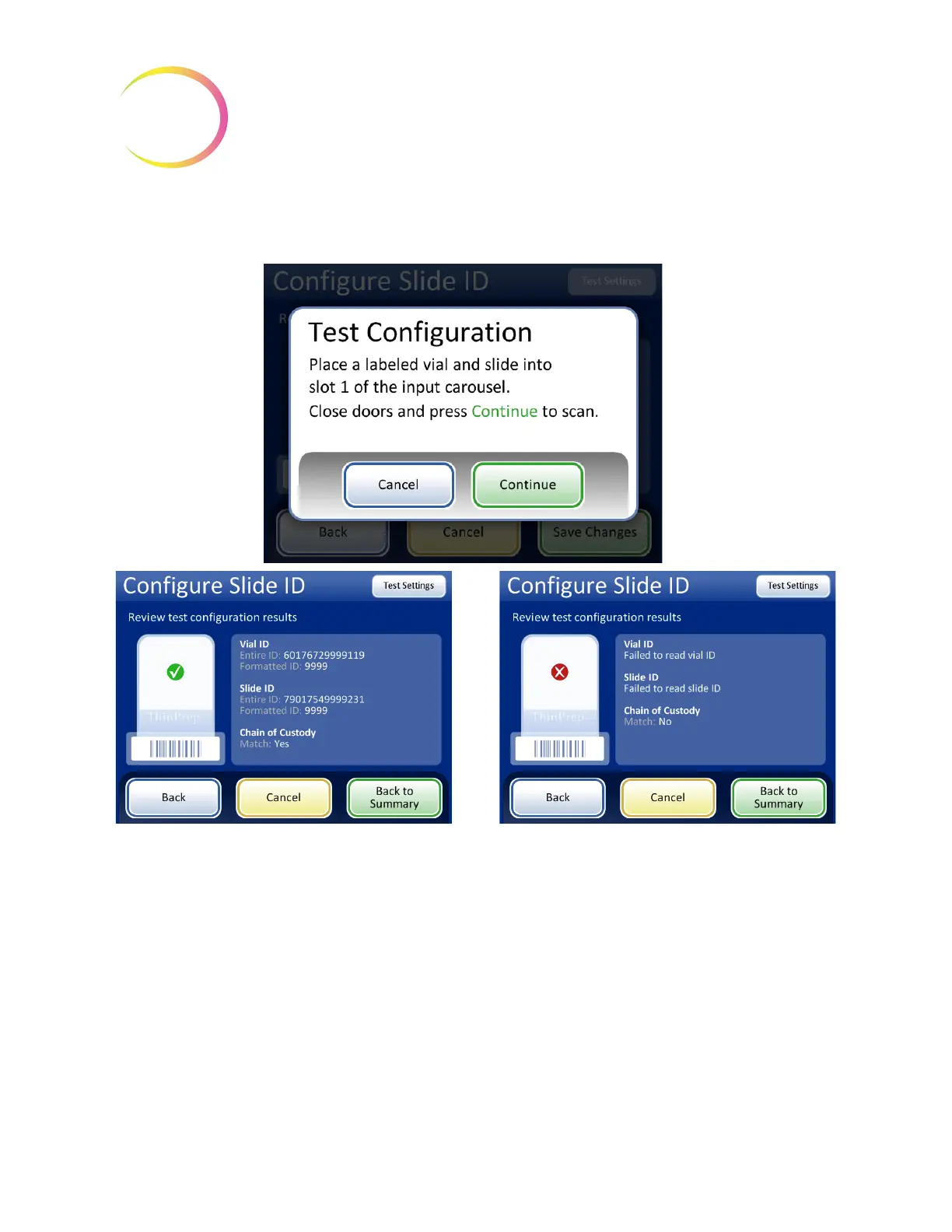 The screen display shows the vial ID that was scanned, the slide ID that was scanned and the section