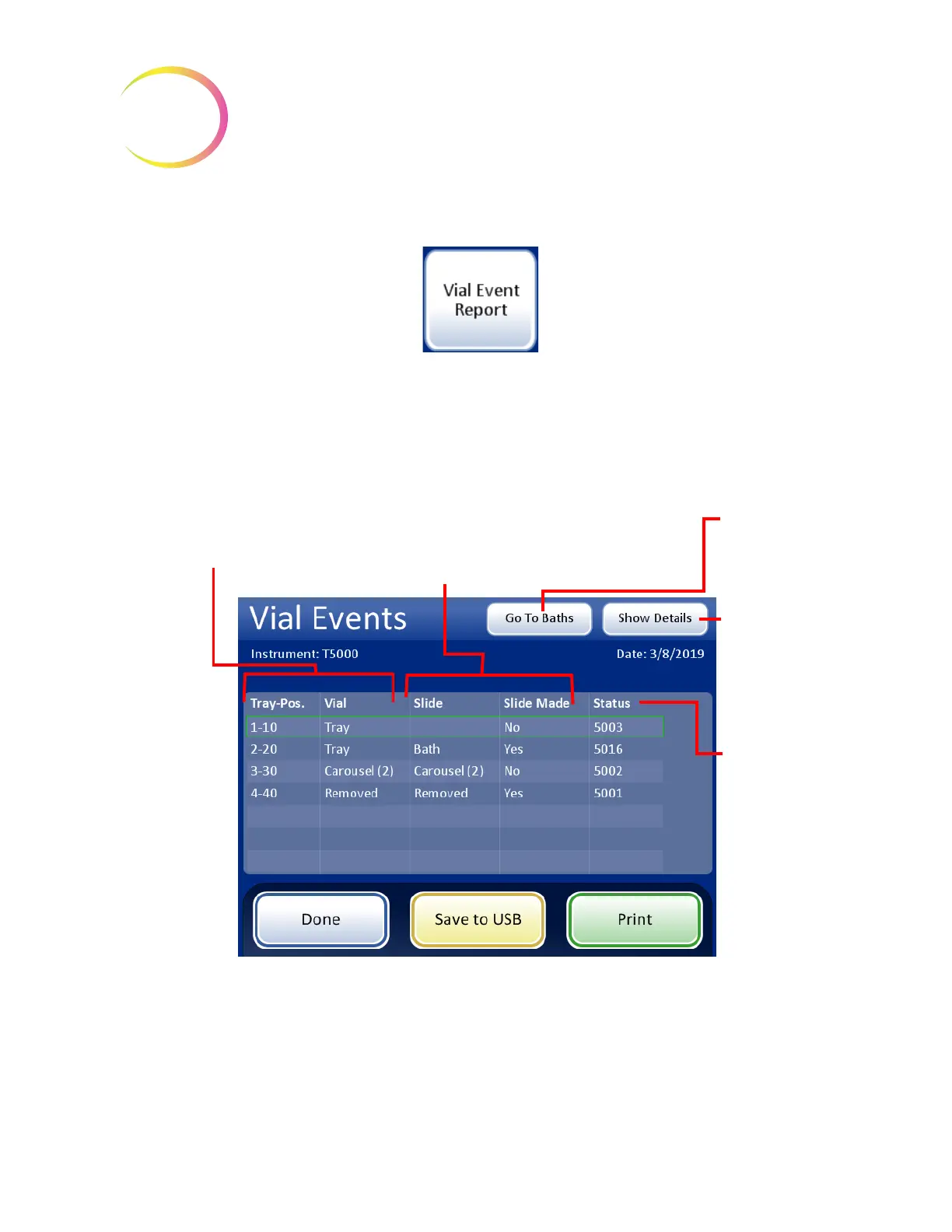 A Vial Event Report is generated every time vials are processed. The vial events report identifies the