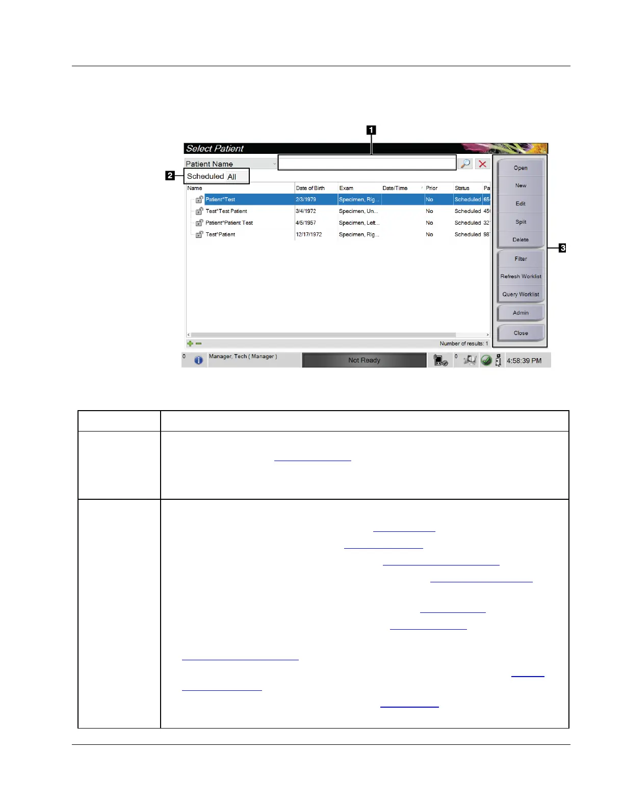 • Refresh Worklist: Update the Scheduled Patient Worklist information — refer to