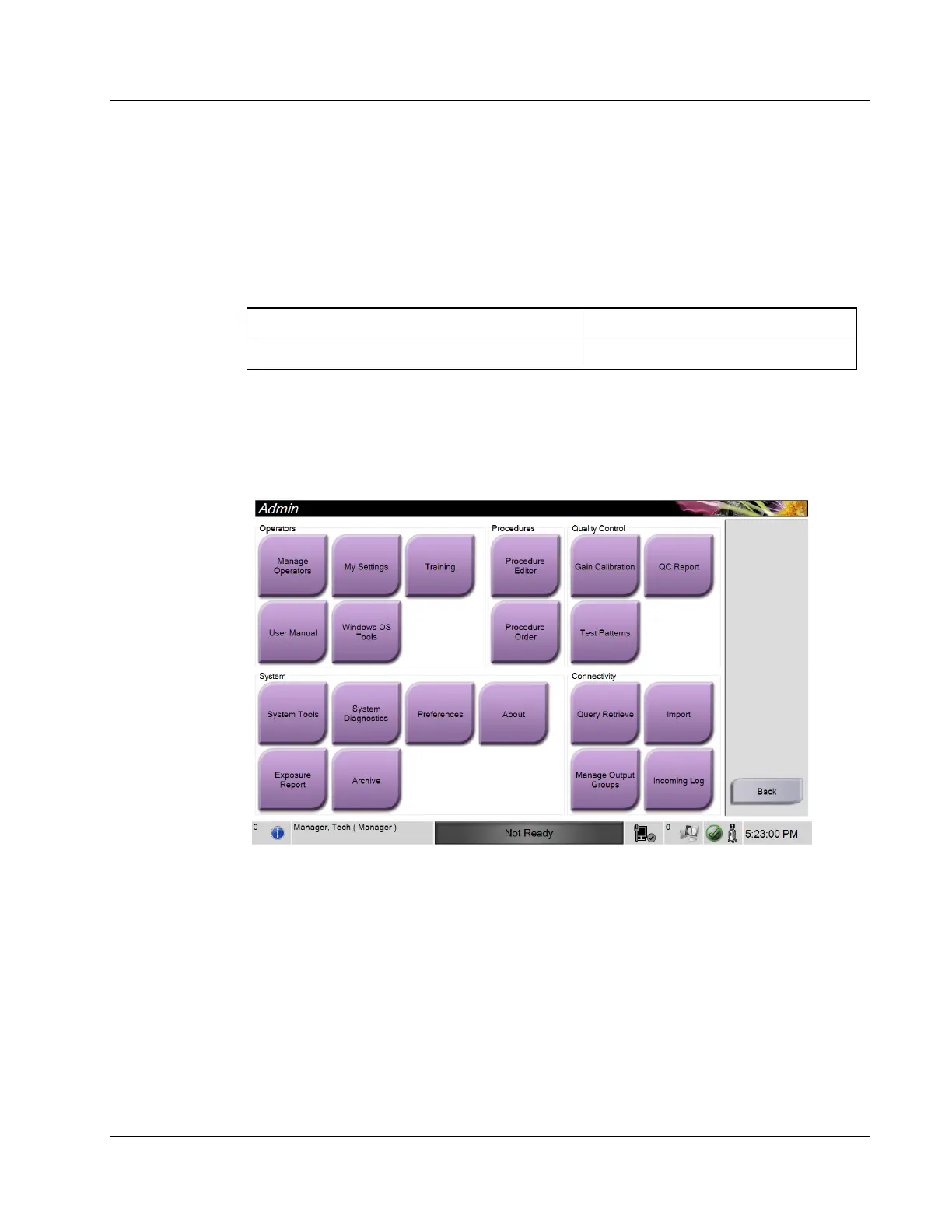 From the Admin screen, select one of the following buttons: Gain Calibration or Test