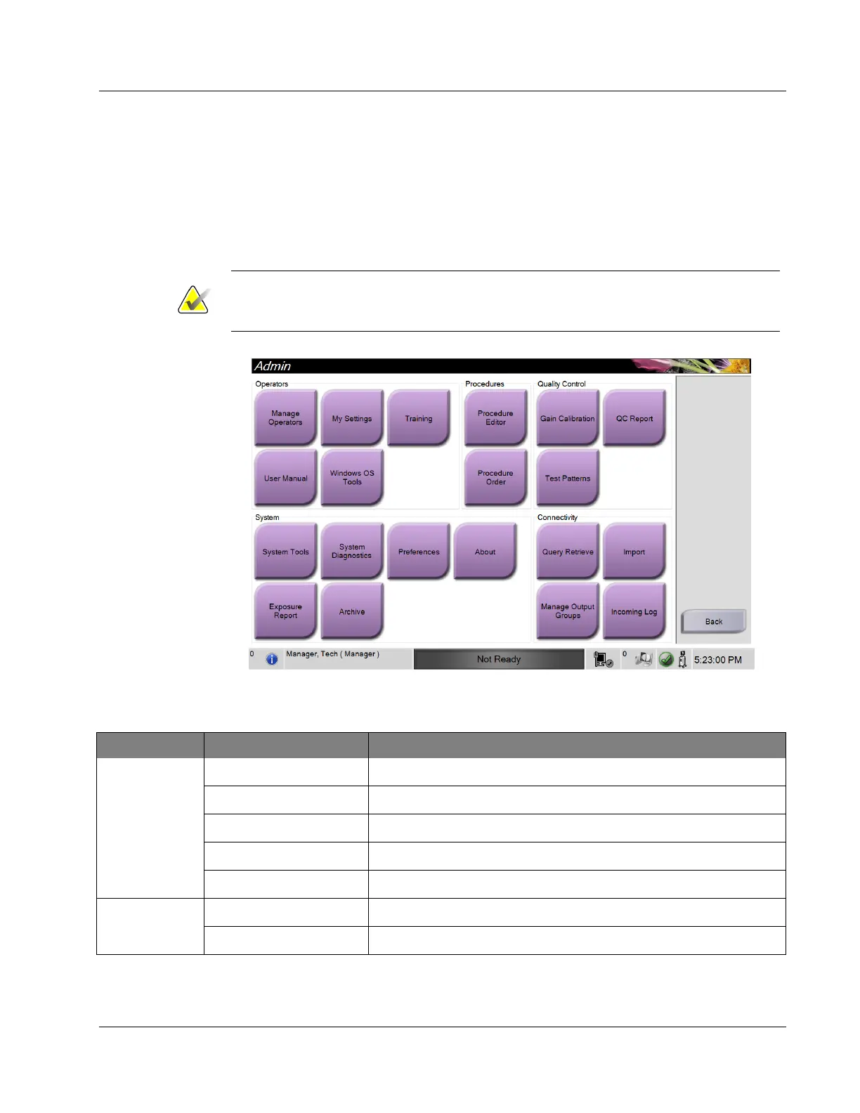 A Manager and a Hologic Service User have access to all functions on the Admin