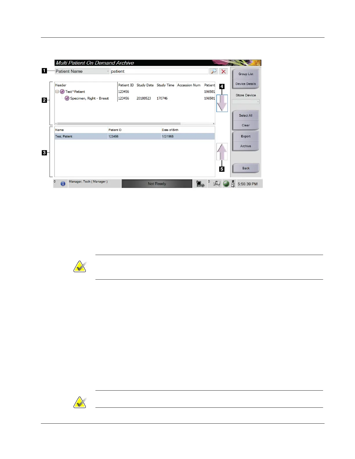 • Select the Down Arrow (item 4) on the screen to move the selected patients to the