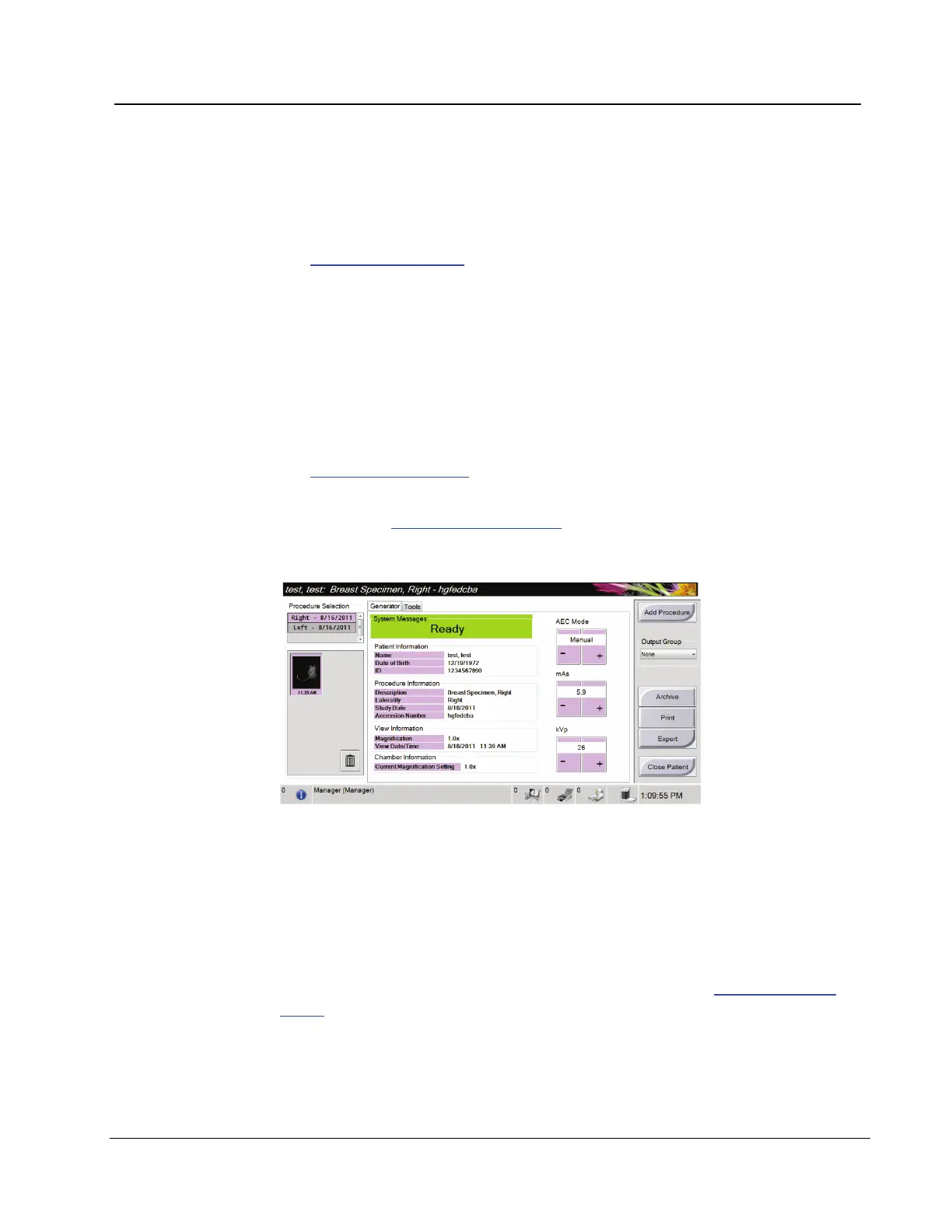 2. In the Procedure screen, set the exposure techniques and select the output devices.