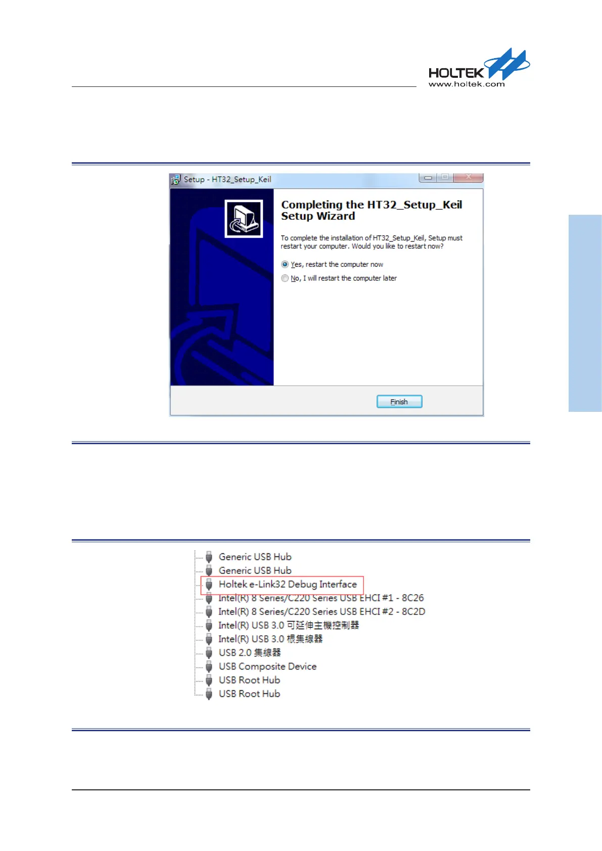 If the e-Link32 is connected, a connection device named “Holtek e-Link32 Debug Interface” will