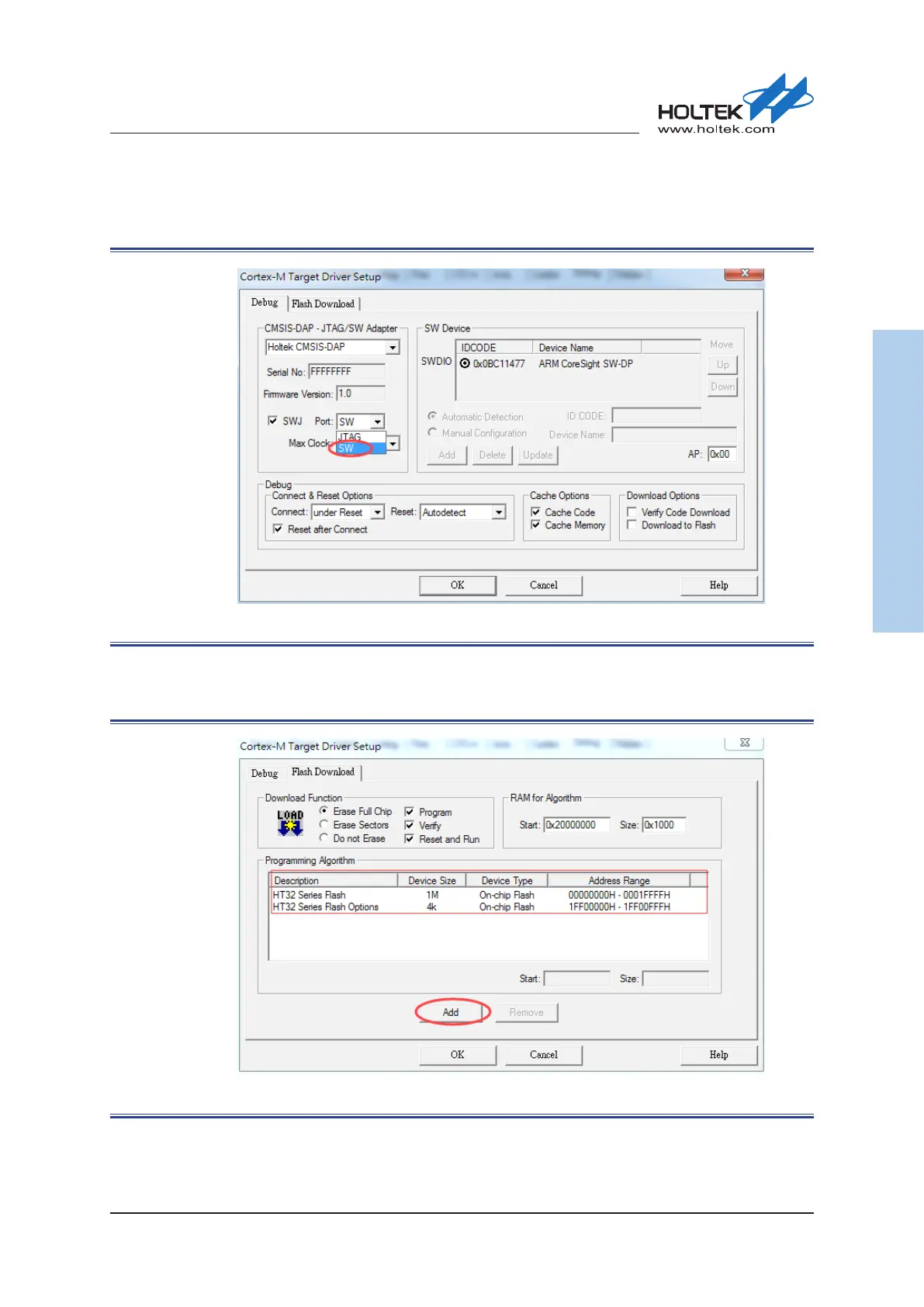 After the bebugger is selected, click the “Settings” button on the right side to select the SW