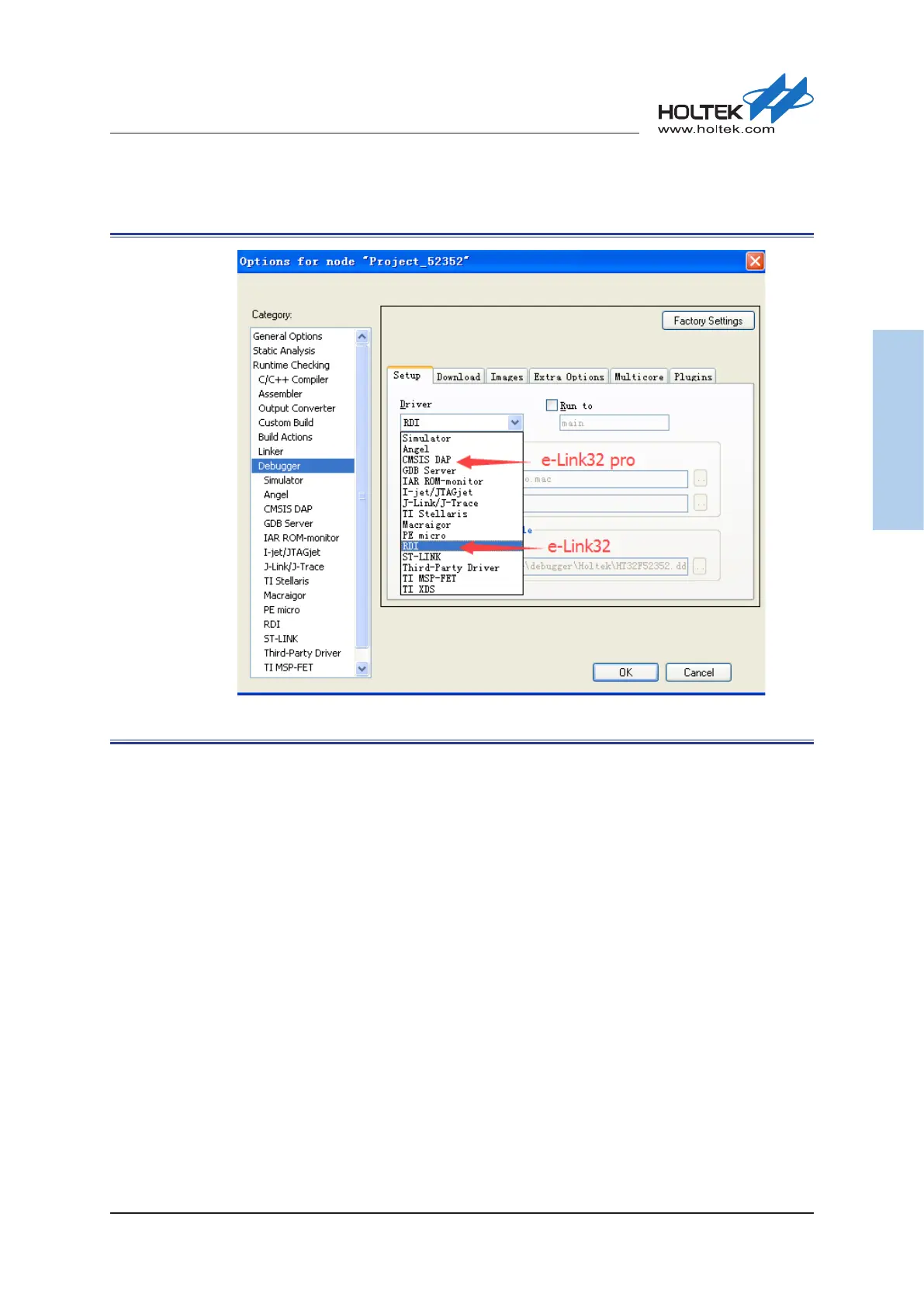 Click “Debugger” to select “RDI” for e-Link32 or select “CMSIS DAP” for e-Link32 Pro.