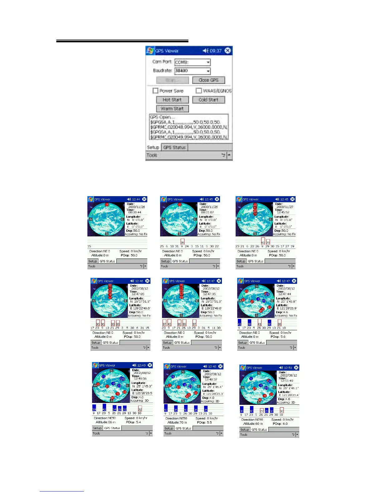 6. Select GPS Status to view the satellite diagrams as shown below.