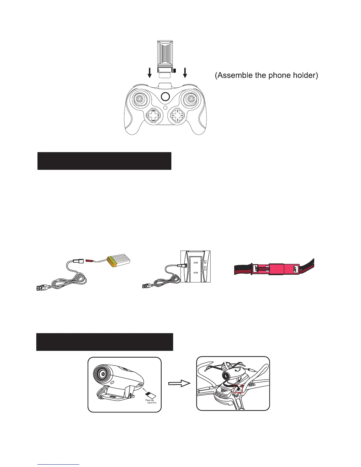 charging plug at the bottom of the drone (marked as “CHA”). The charger indicator will turn off,