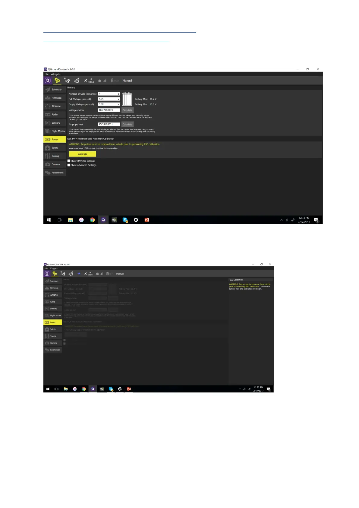 Warning: propellers must be removed from the vehicle prior to performing ESC calibration!