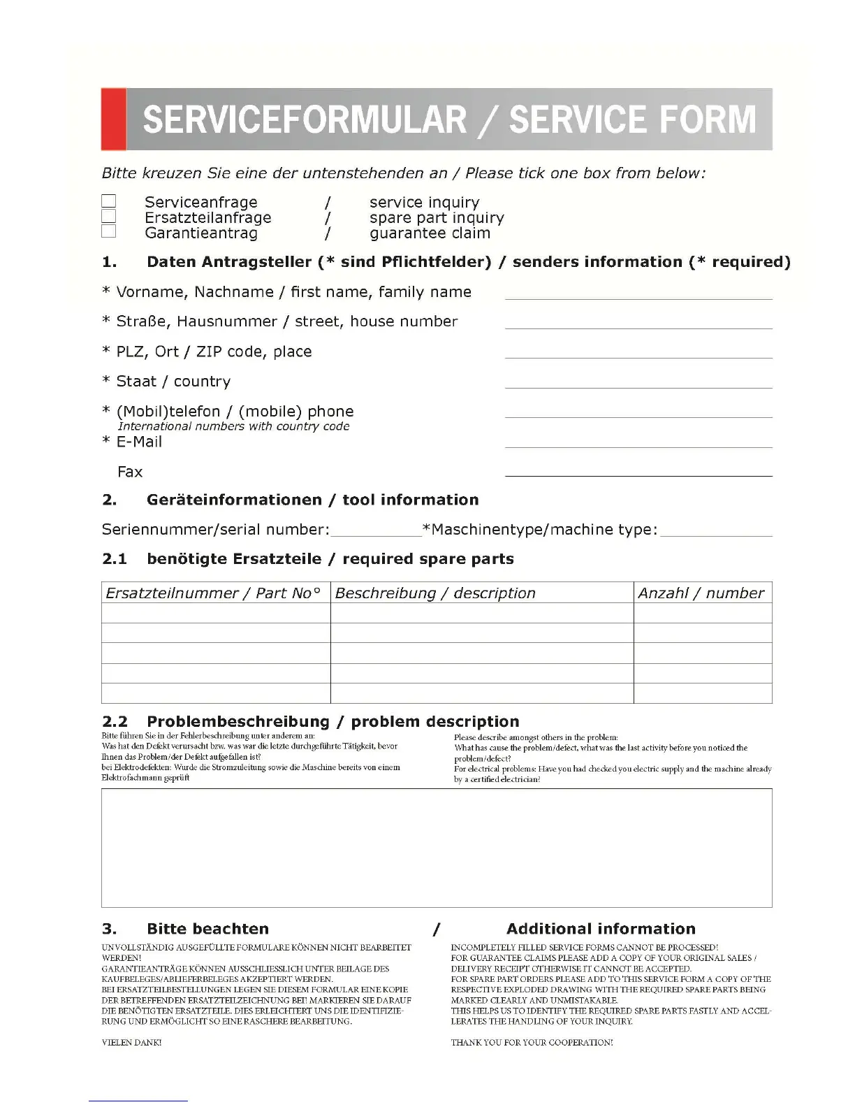 Holzmann D 460FXL - Service Request Form