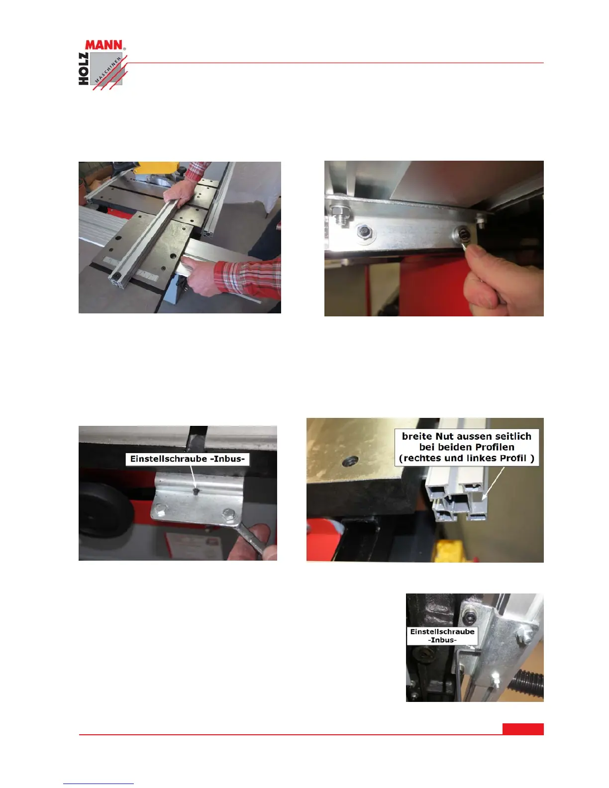 Die 4 Muttern an beiden Halterungen leicht festziehen, sodass das Schiebetischgrundprofil ver-