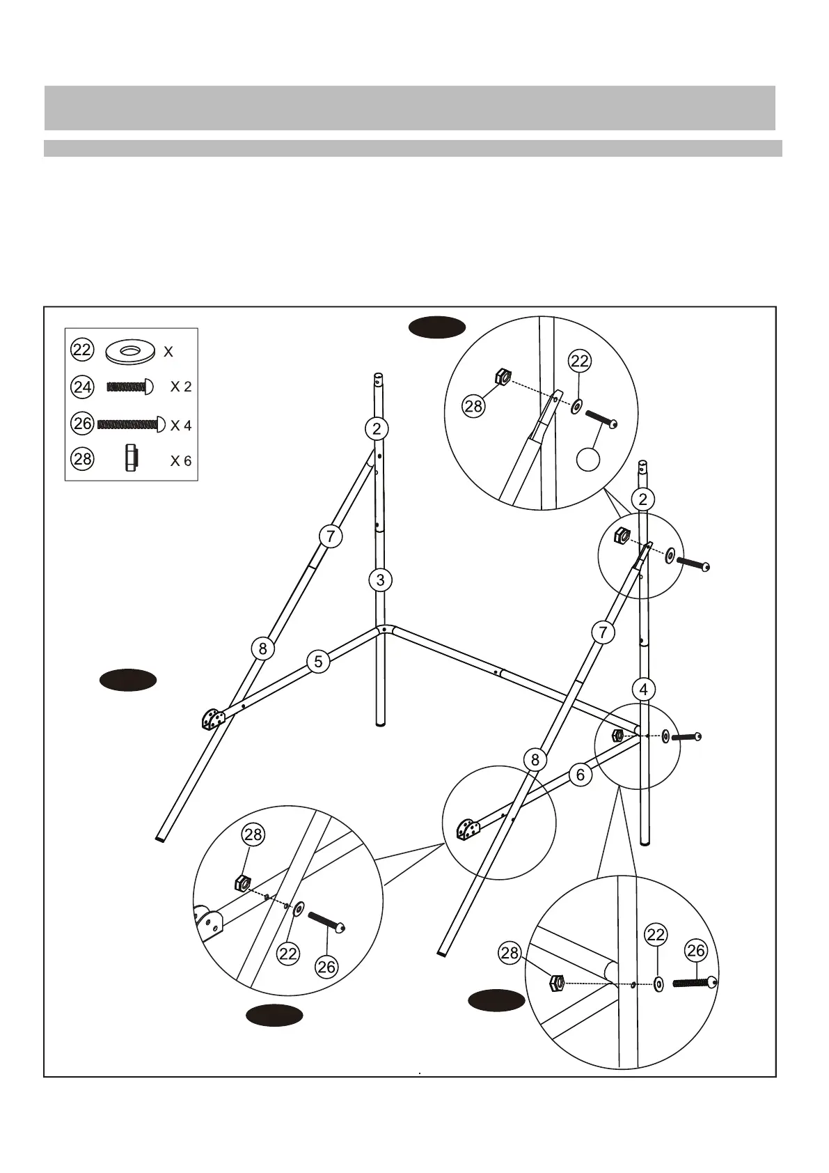 5.Fixar os tubos 7 e 8 ao tubo 2 utilizando os parafusos (24), anilhas (22) e porcas (28), como