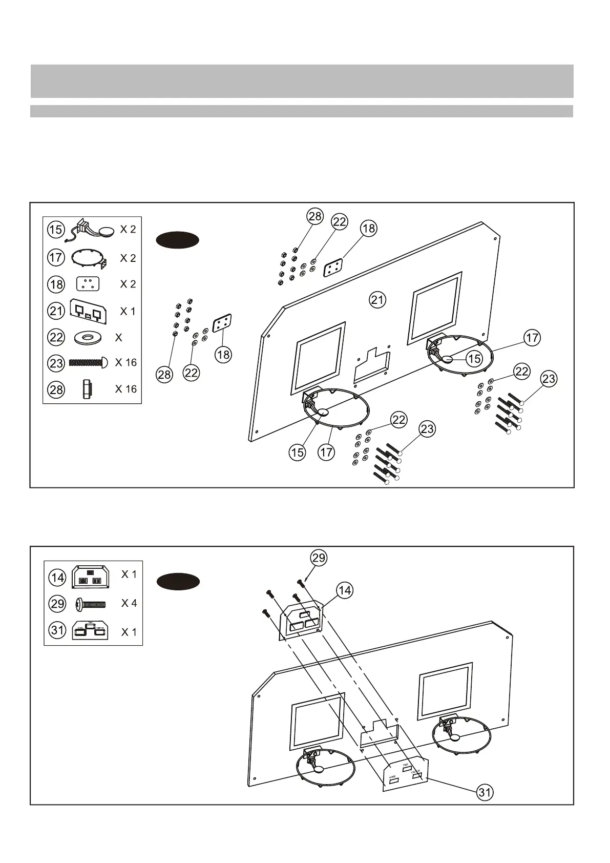 9.Ligar o cesto (17) e as placas de suporte do cesto (18) à placa (21) utilizando os parafusos (23),
