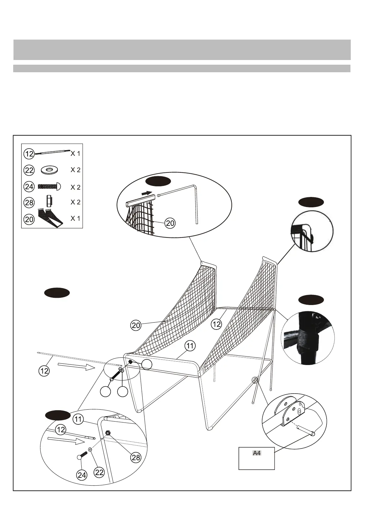 12.Passar o tubo 12 através da manga na frente da rede de retorno da bola (20). Fixar o lado