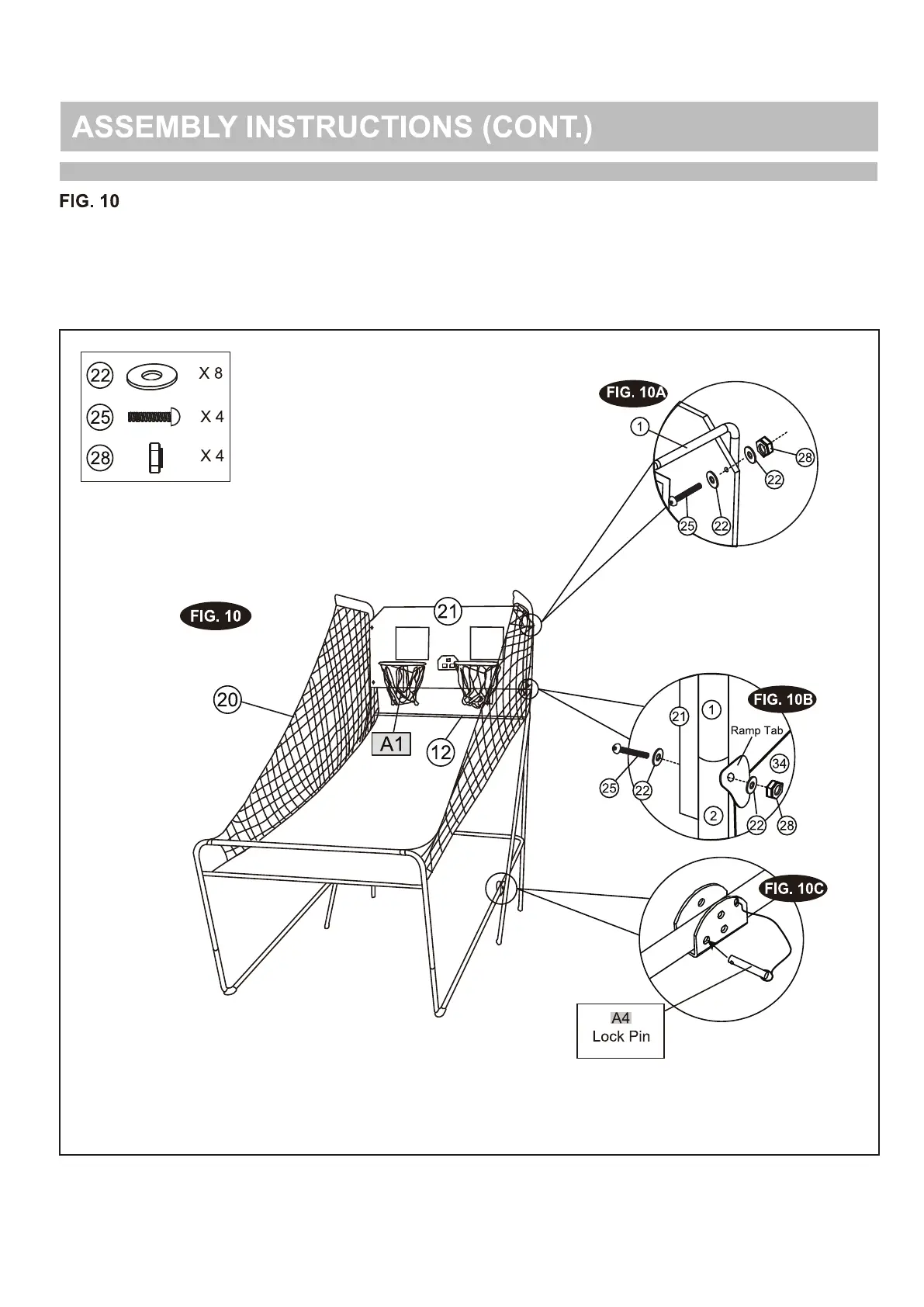 as shown in FIG. 10A. Attach the ramp tabs of the ball return net (20) to the holes on the bottom of