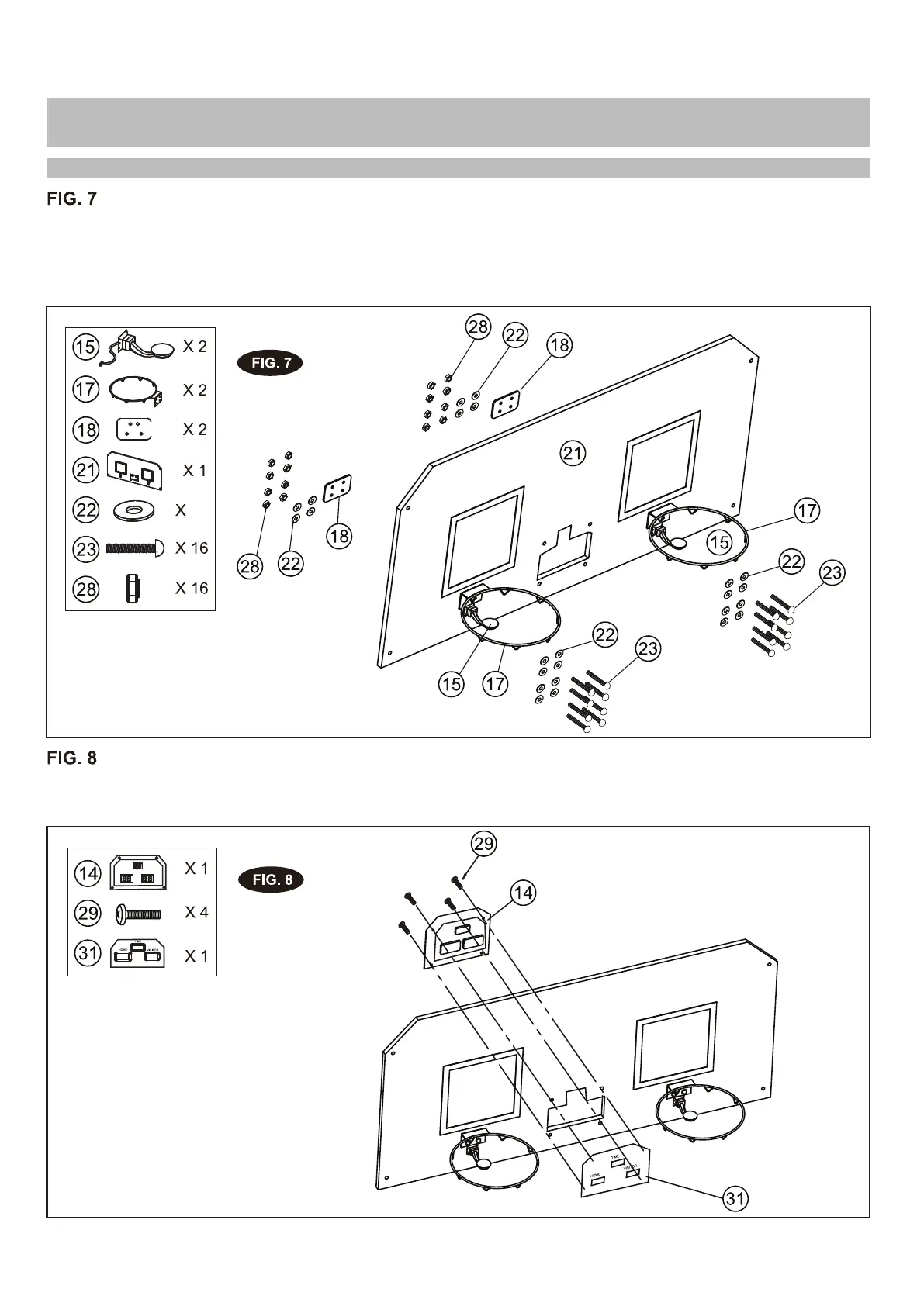 11.Fixez le panier (17) et les plaques de support de panier (18) au panneau arrière (21) à l’aide des