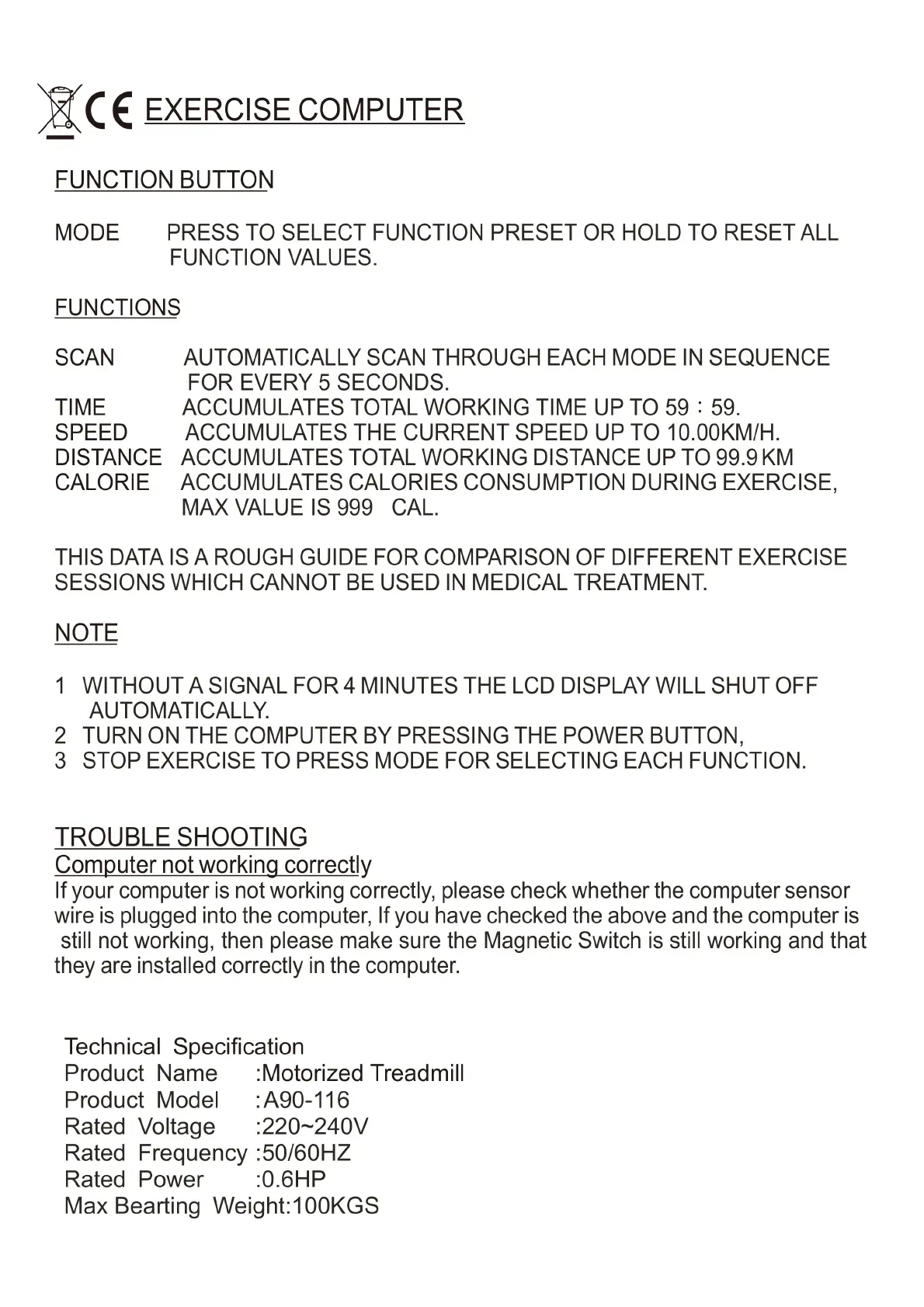 HOMCOM A90-116 - EXERCISE COMPUTER; FUNCTION BUTTON; FUNCTIONS; TROUBLE SHOOTING