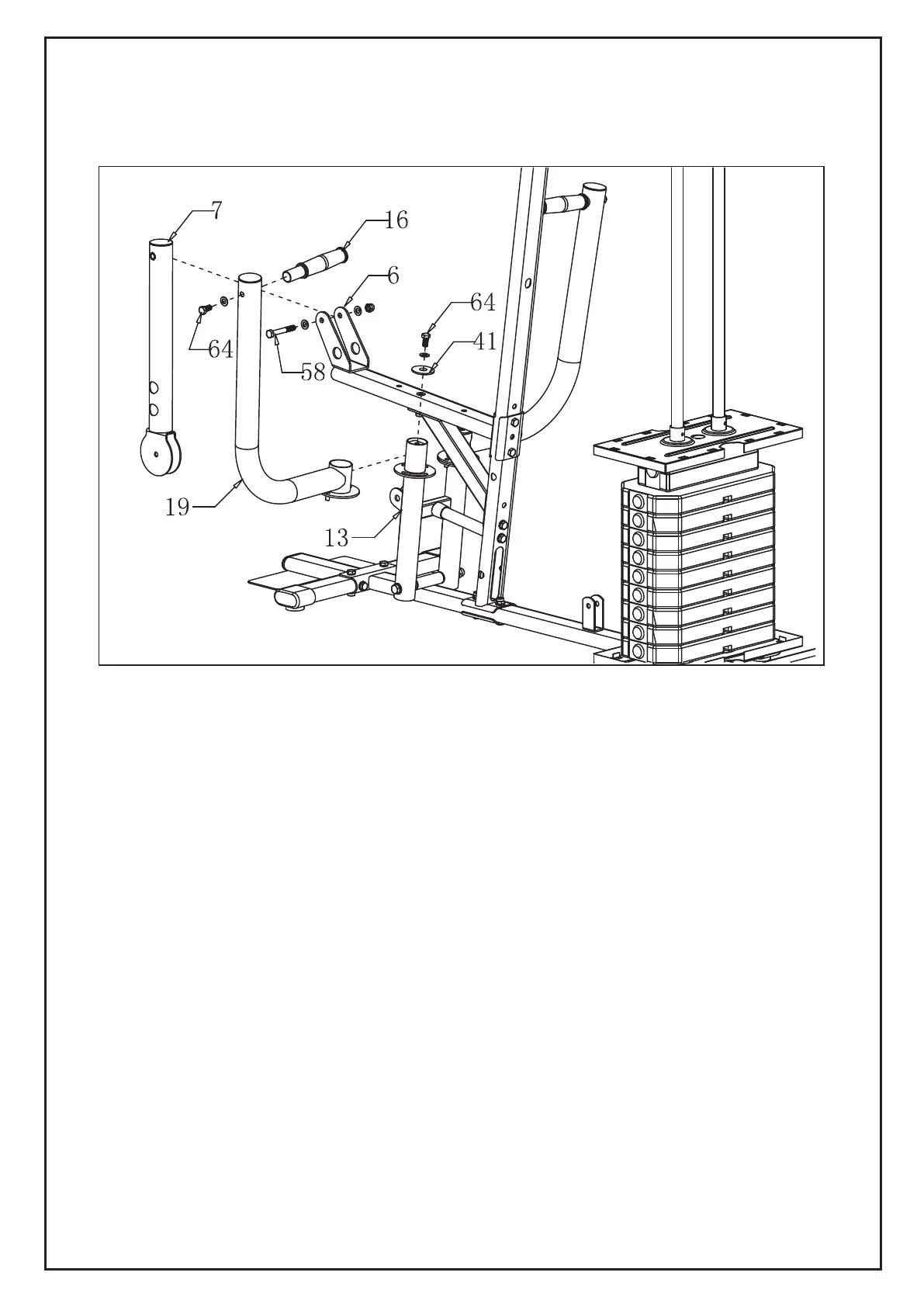 2. Insert the rowing arm (19) into the H-shaped support (7) using the big