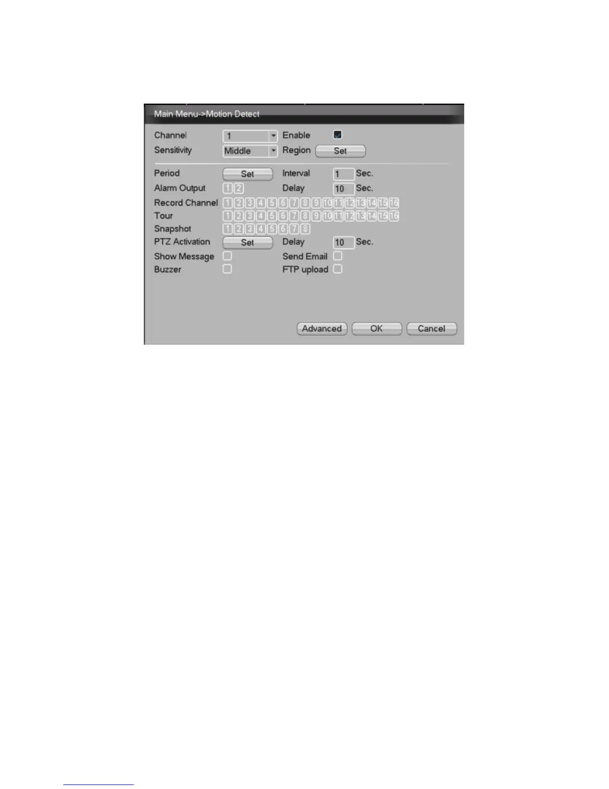 Channel, Tour, PTZ Activation, Show Message,