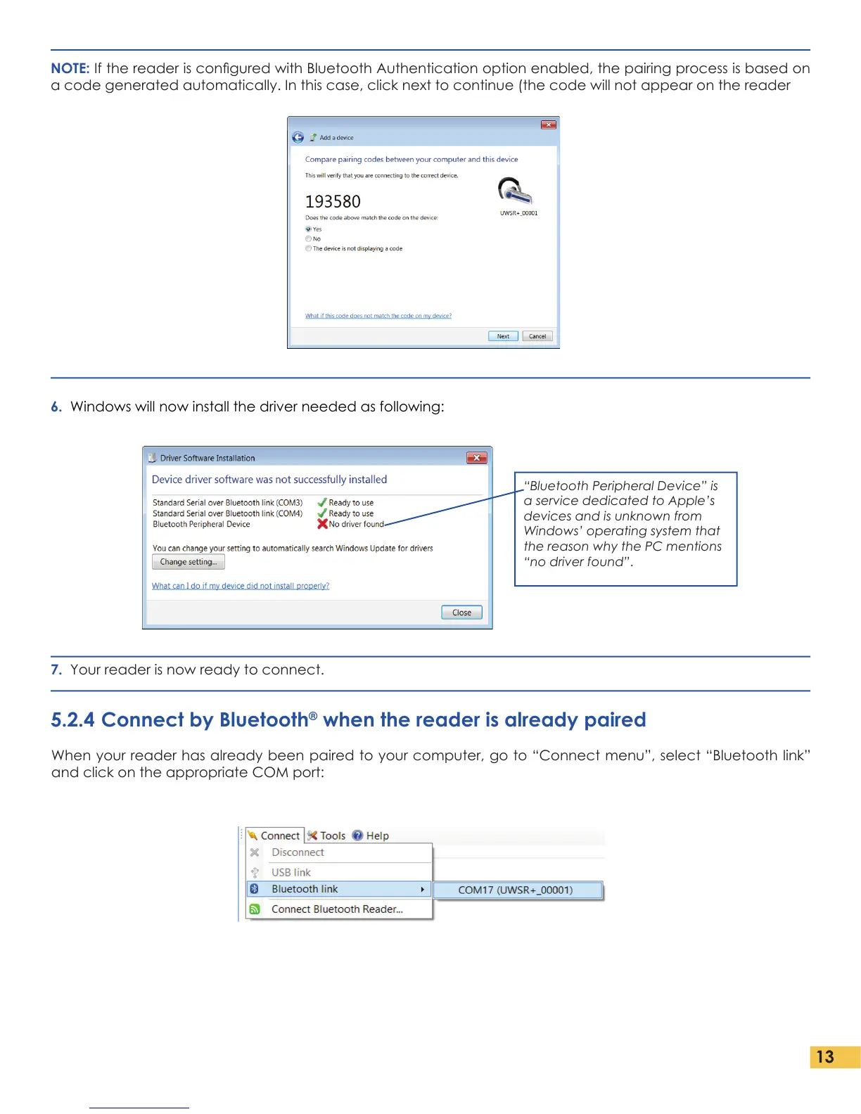 When your reader has already been paired to your computer, go to “Connect menu”, select “Bluetooth link”