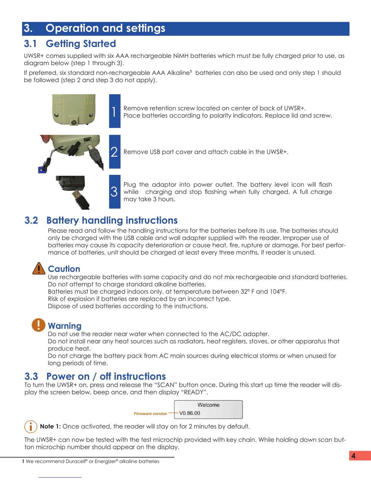 UWSR+ comes supplied with six AAA rechargeable NiMH batteries which must be fully charged prior to use, as