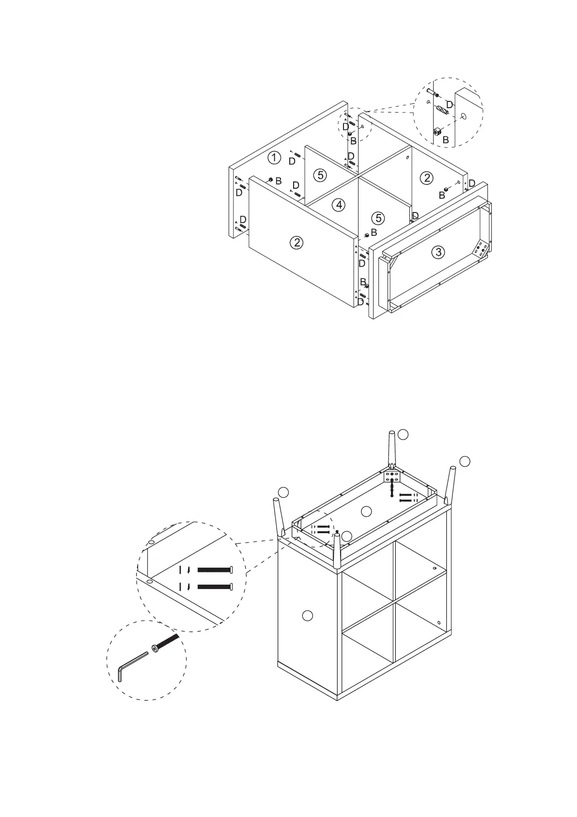 Attach top panel (1) and bottom panel (3) to the unit using 12 x dowels (D).