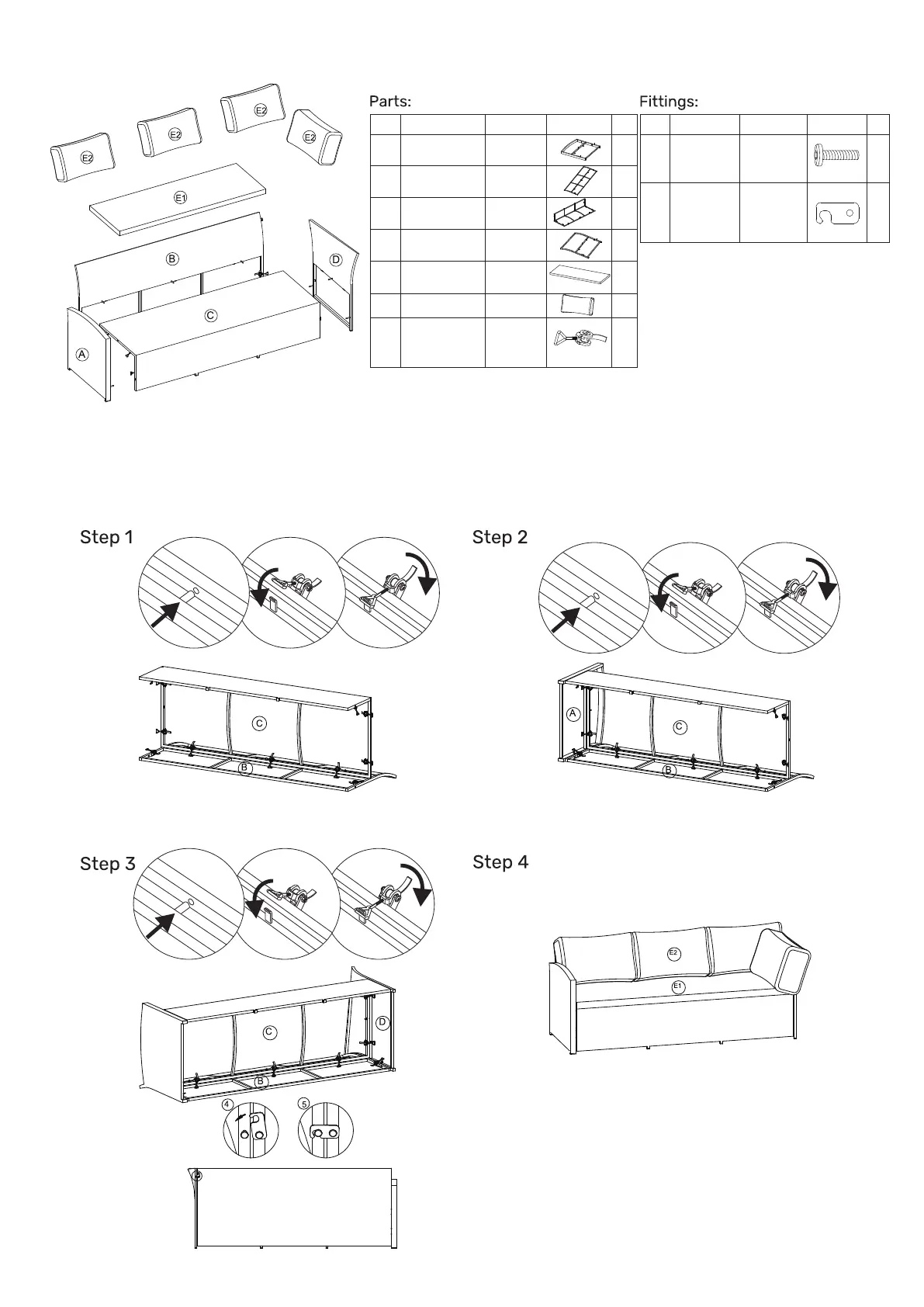 Step 4: Place the seat cushion (E1) and back cushion (E2) on the sofa.