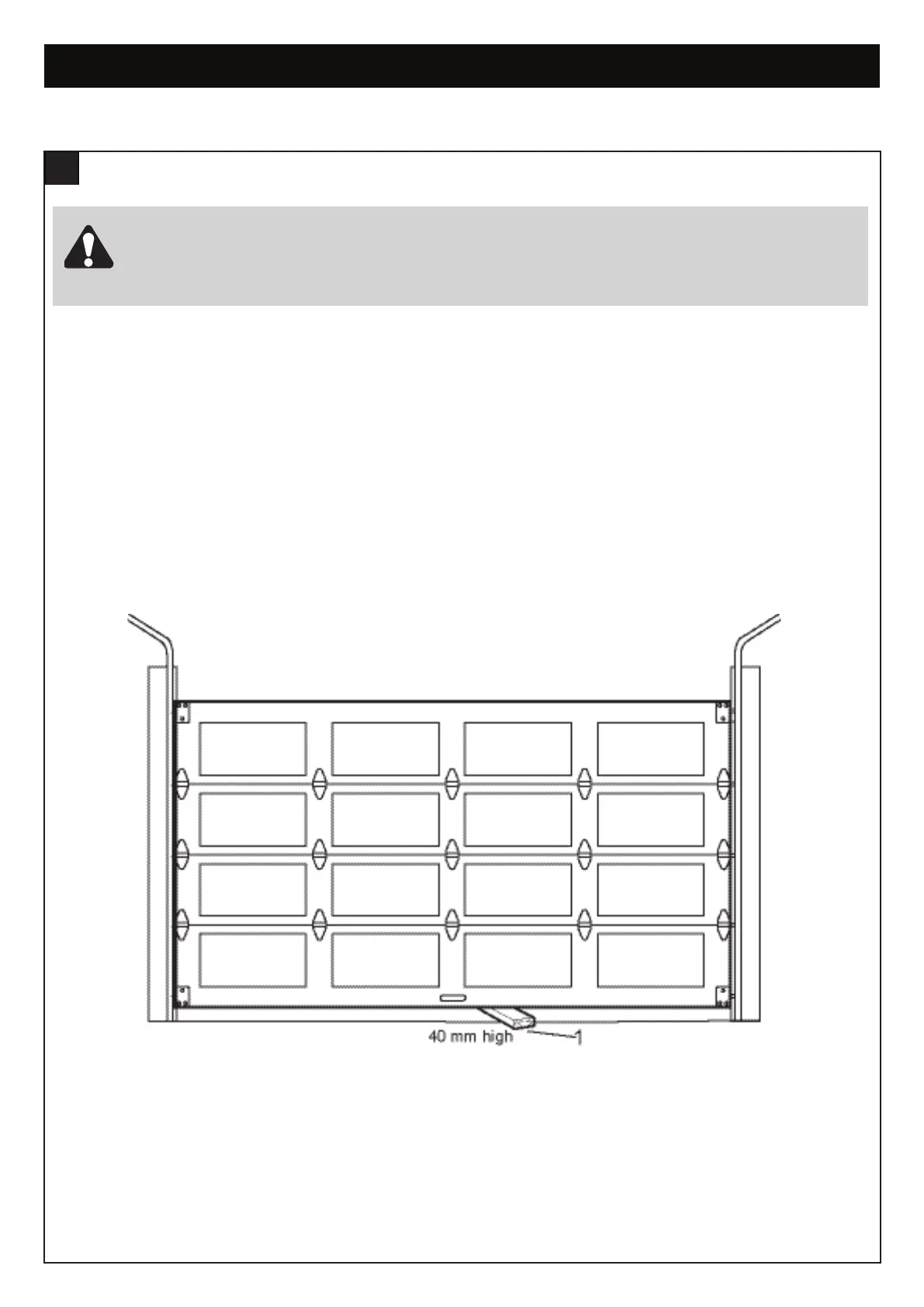 Procedure: With door opened place a 40 mm obstacle (1) laid flat on the floor under the garage door. Operate the door in the