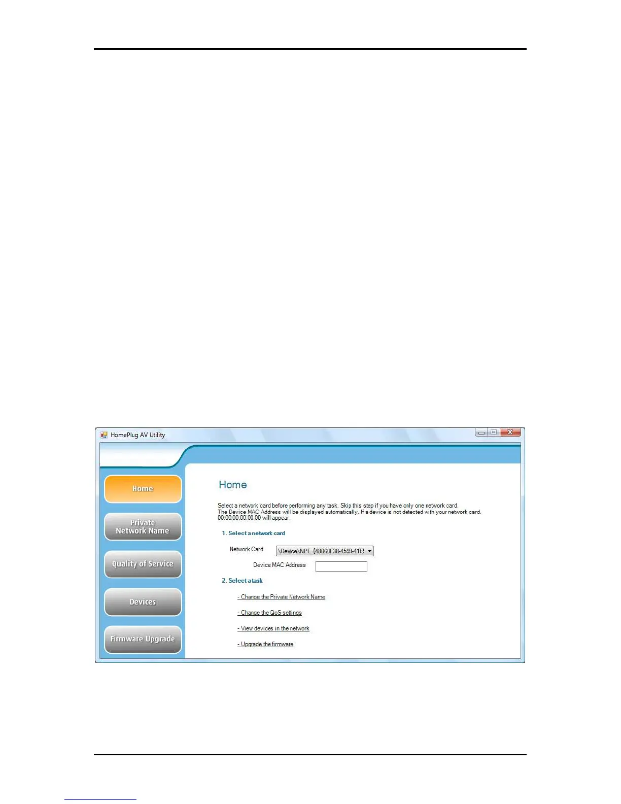 Home provides a list of all the possible tasks you can perform in the HomePlug AV Utility.