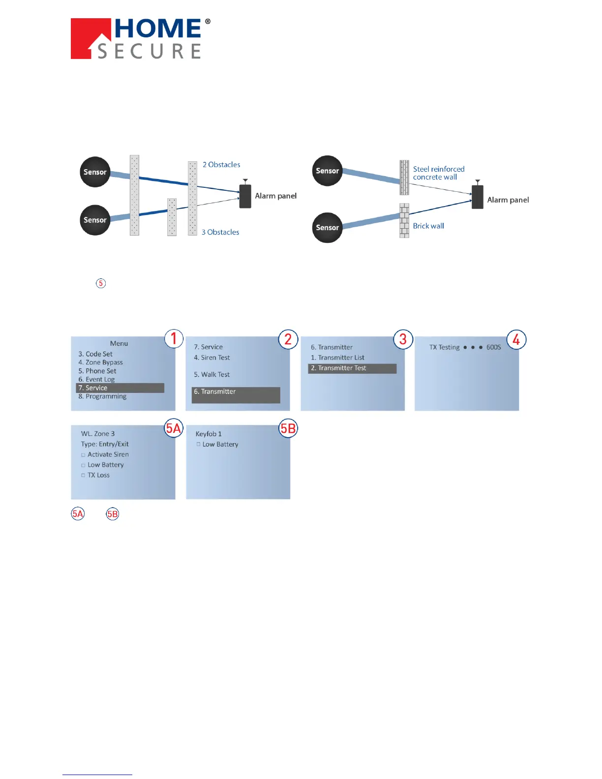 the alarm panel. Distance and walls will weaken the wireless signal reach. In normal houses, the reach is