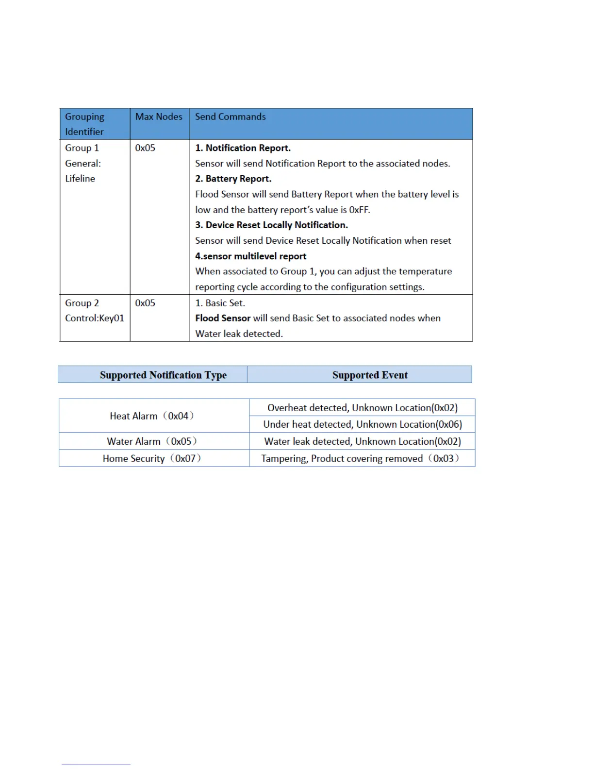 c. When Water leak detected, send Water Alarm (05) and Water leak detected, Unknown