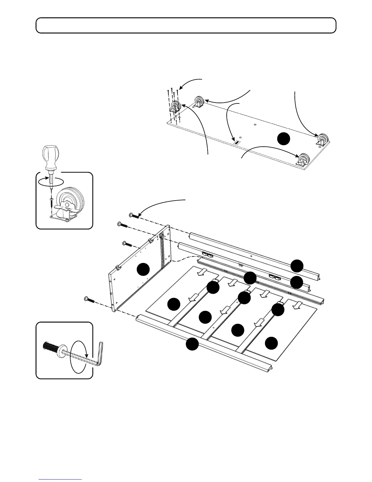 Attach Back Stretcher (E1) and Front Pieces (I) and (J) to unit with Head Cap Bolts (short).