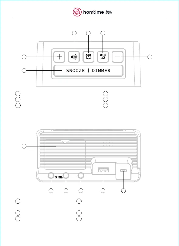 Press to adjust clock and alarm time Snooze / LED dimmable