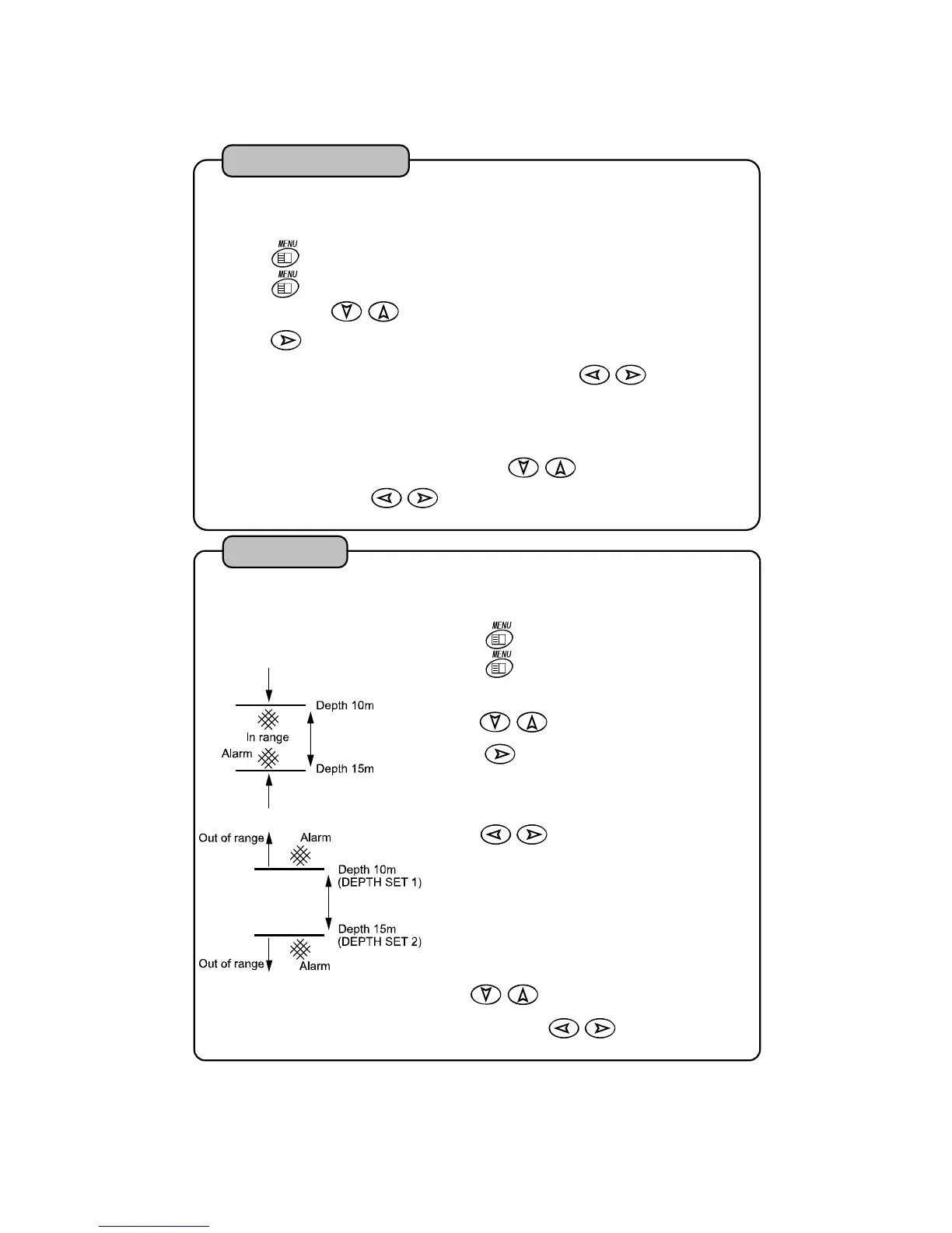 Alarm goes off within or out of two set values (DEPTH SET 1, DEPTH SET 2).
