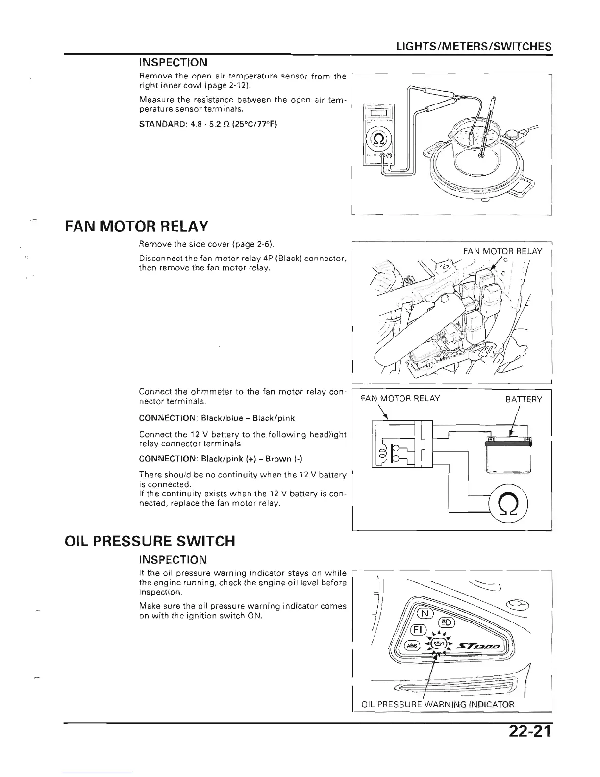 Honda 2003 ST1300 - Fan Motor Relay; Open Air Temperature Sensor Inspection; Oil Pressure Switch Inspection