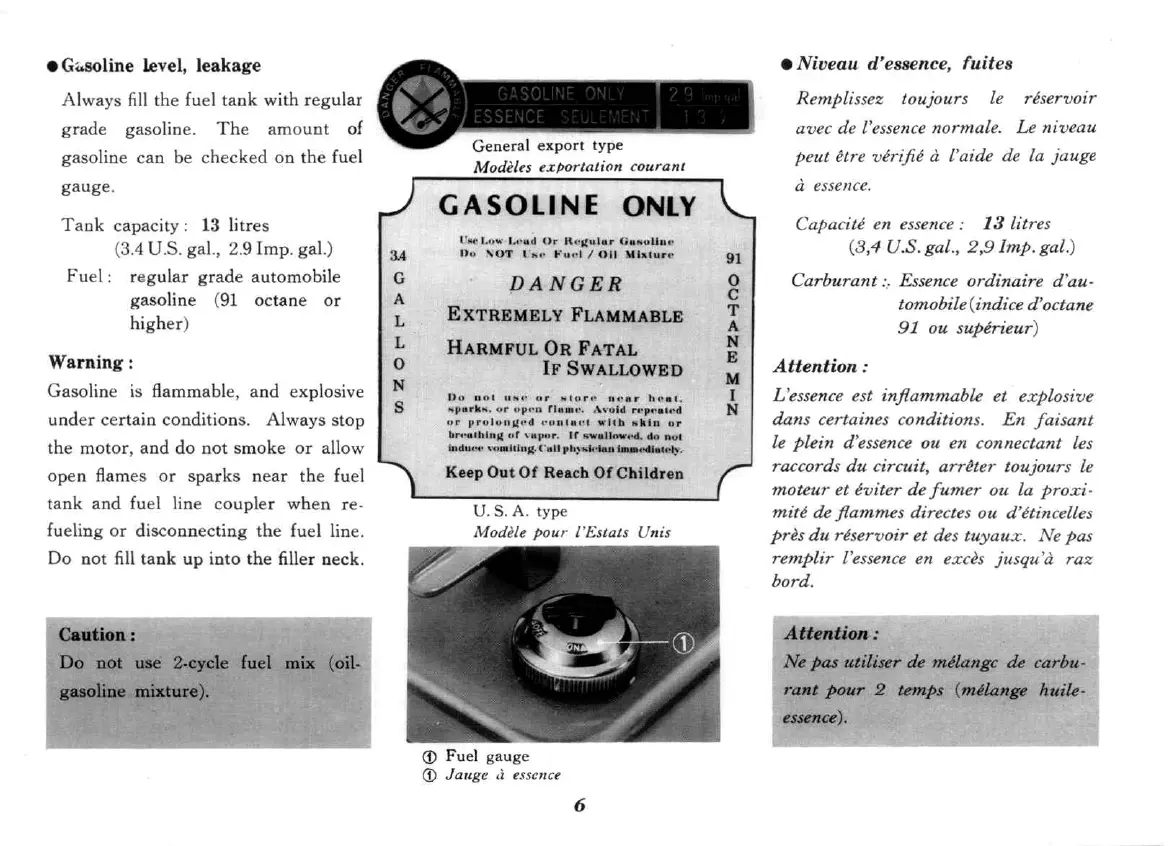 Honda 75 - Gasoline Level and Leakage; Fuel Tank Capacity and Type; Fuel Handling Precautions