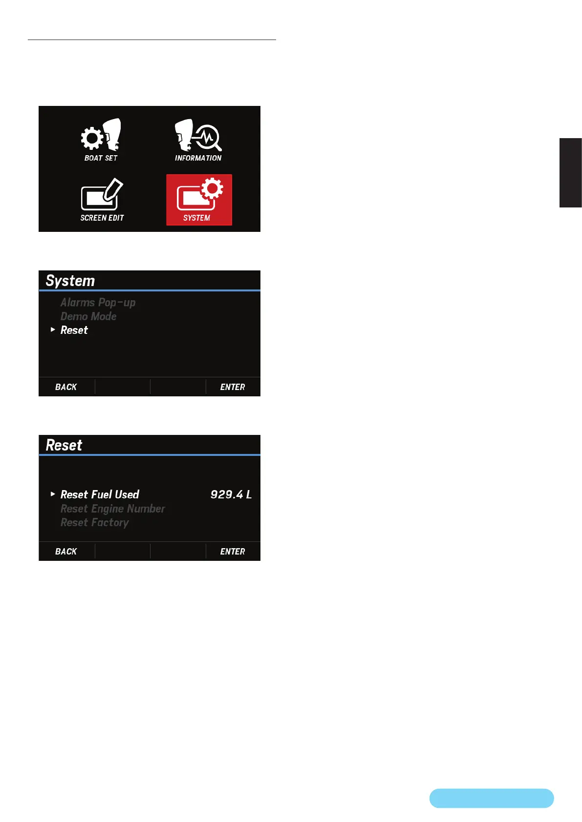3. [∧]/[∨]ボタンを押して Reset Fuel Used を選択し、