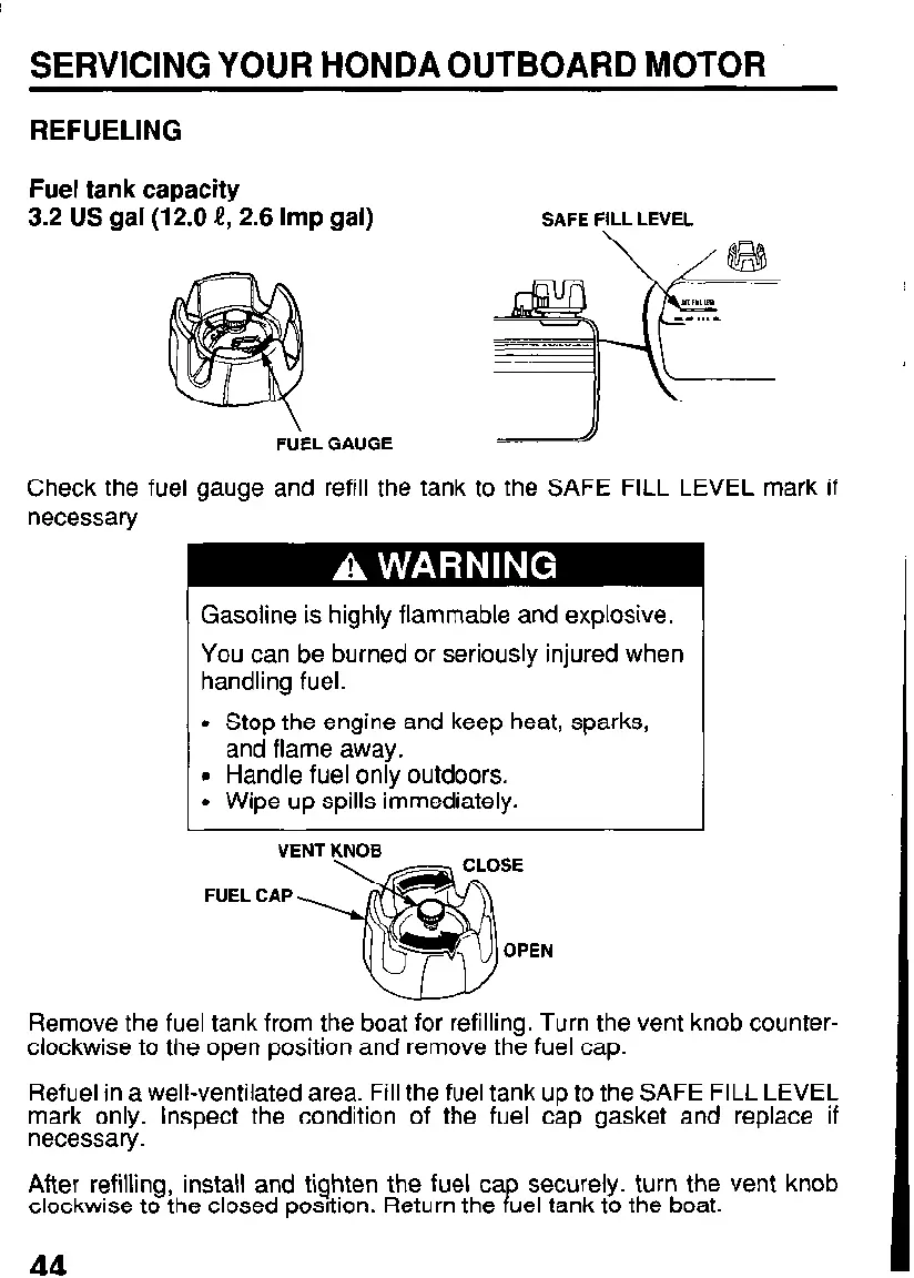 Remove the fuel tank from the boat for refilling. Turn the vent knob counter-