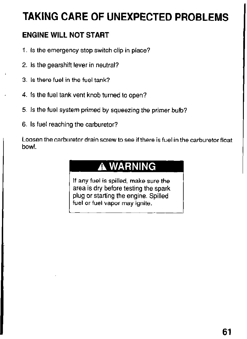 plug or starting the engine. Spilled