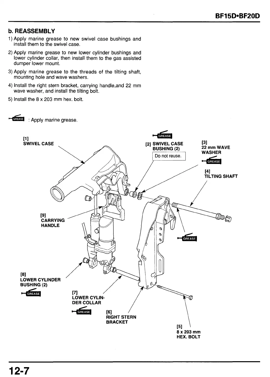1)Apply marine grease to new swivel case bushings and