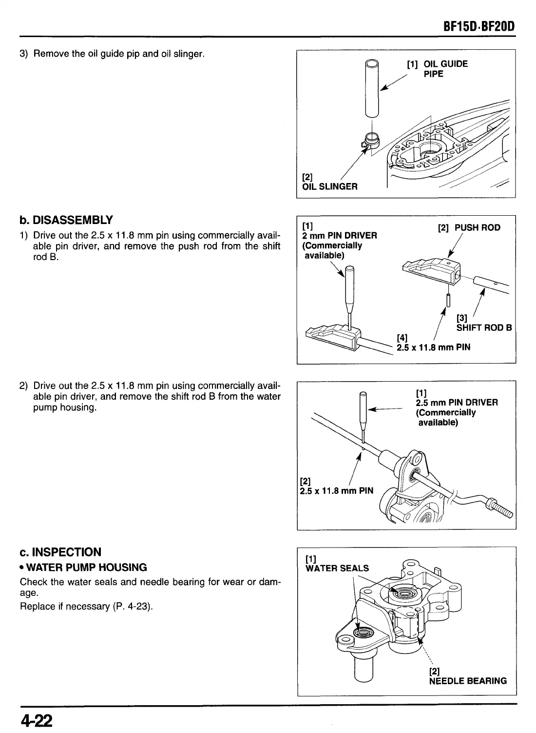 Check the water seals and needle bearing for wear or dam-